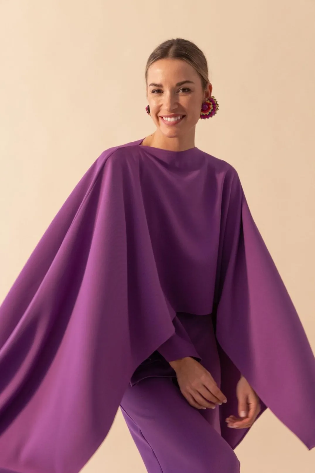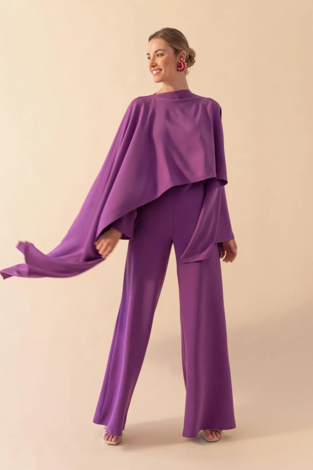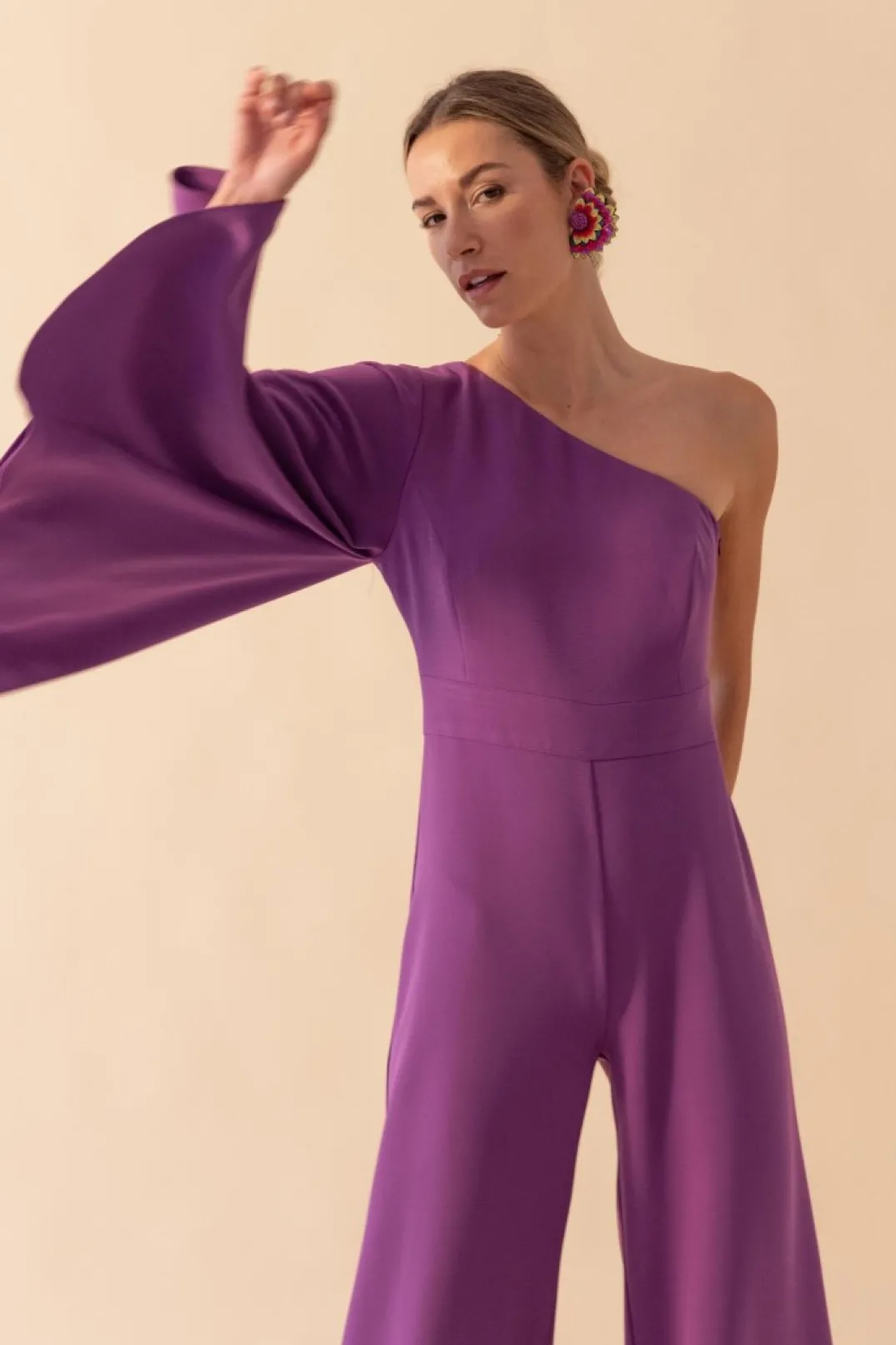 Mono confeccionado en crepe color morado. Manga japonesa asimétrica. Corte en la cintura y pantalón estilo palazzo. Incluye capita confeccionada en gasa color morado.
