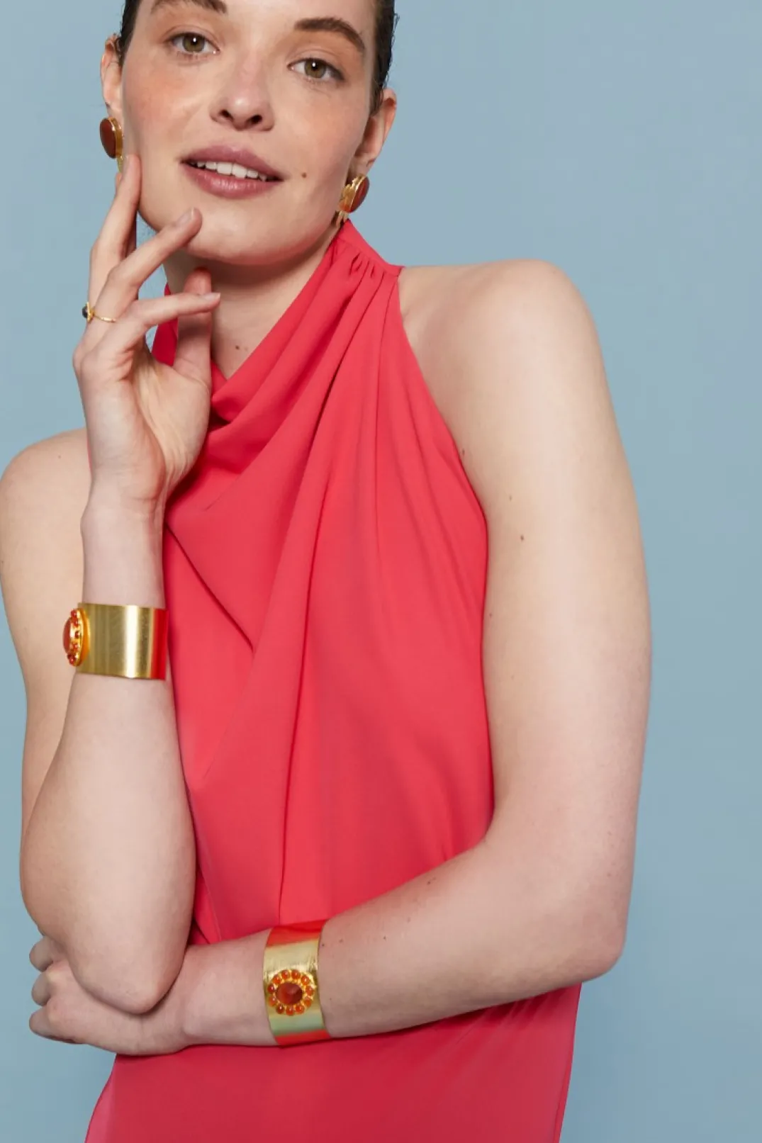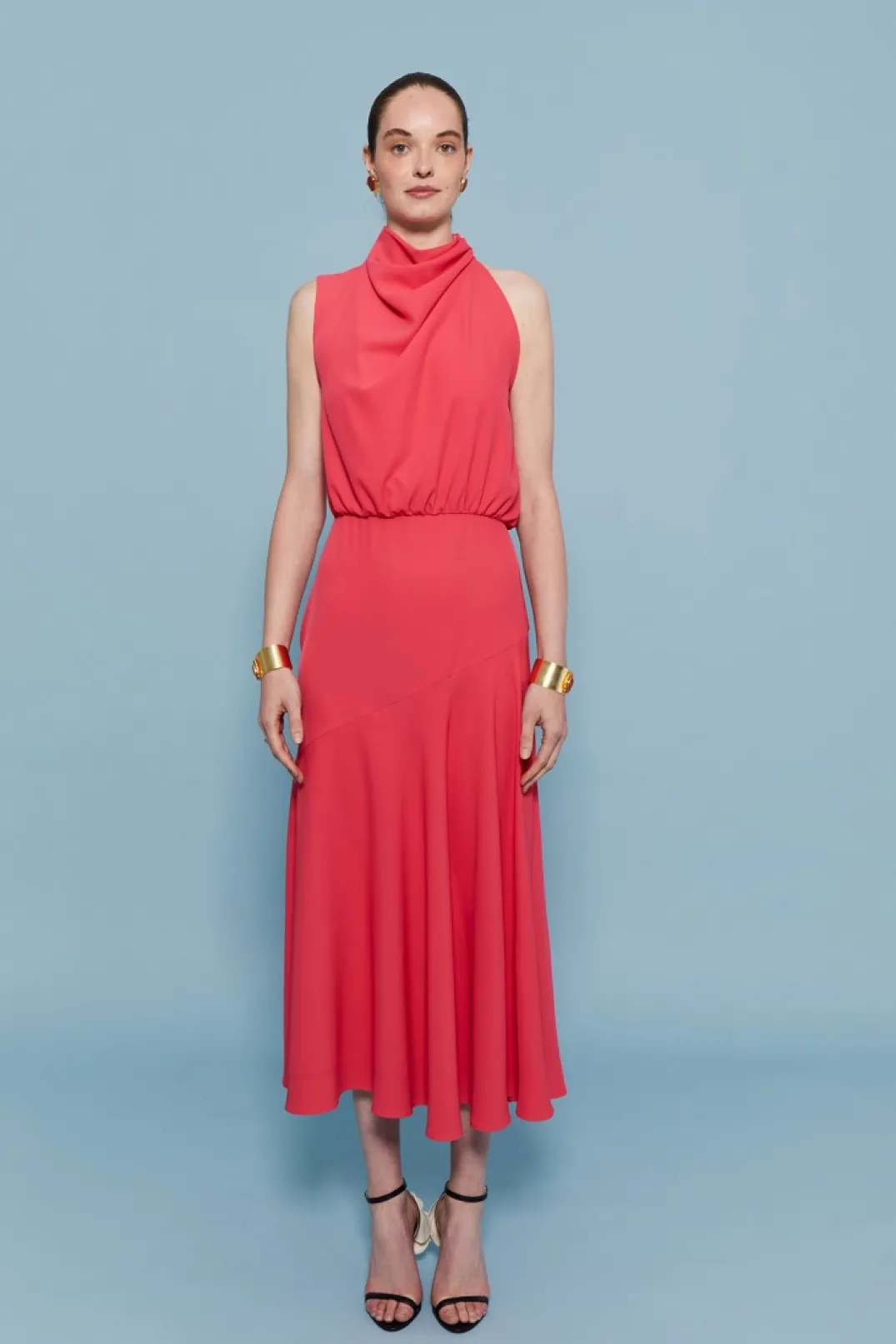 Vestido midi confeccionado en crepe coral. Cuello plisado y escote asimétrico. Corte en la cintura y falda asimétrica fluida. Cierre con doble botón en el cuello y cremallera invisible trasera