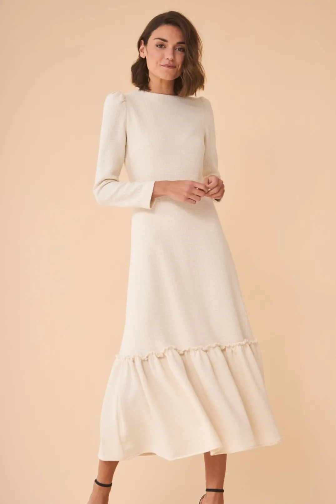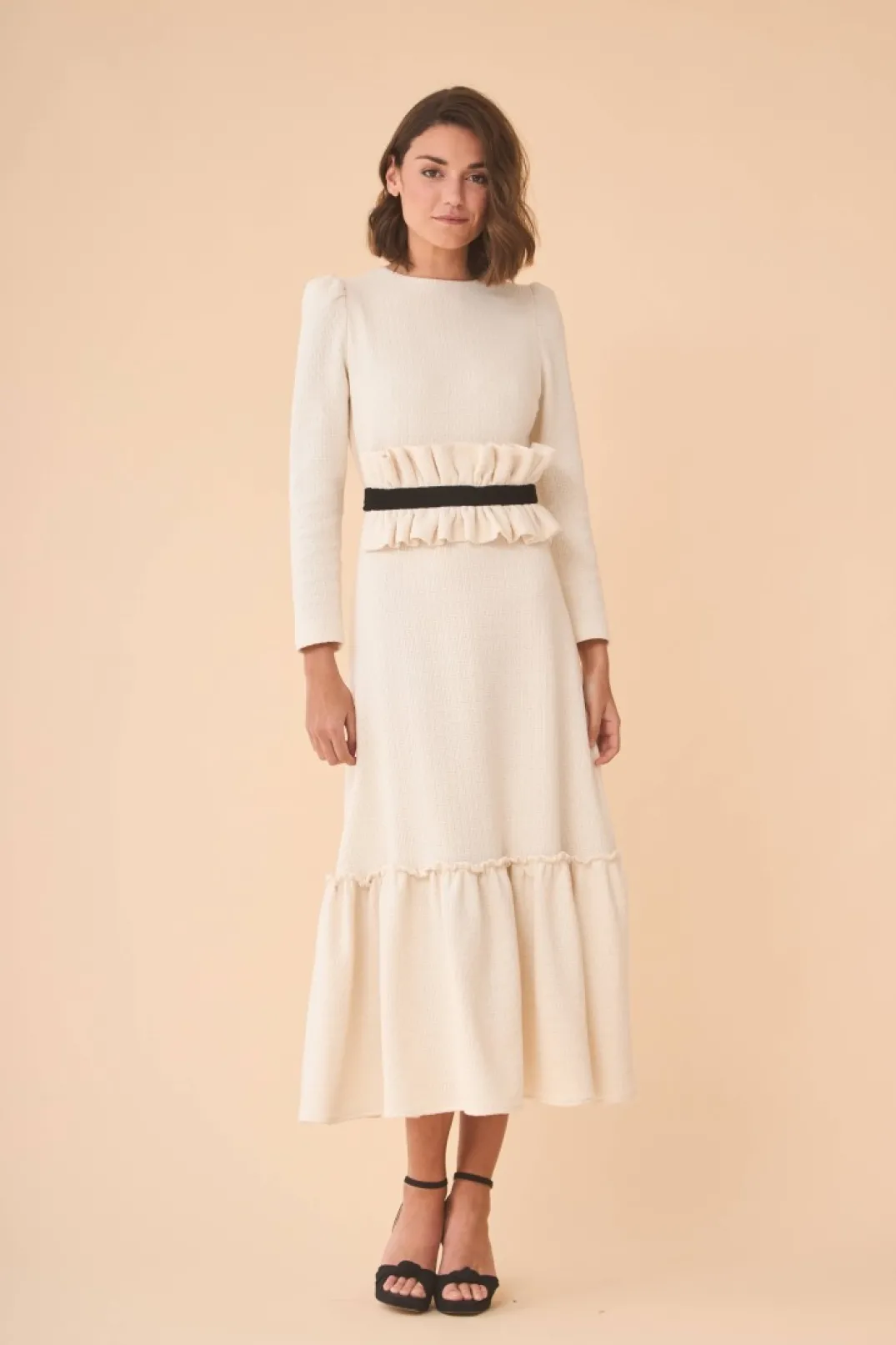 Vestido confeccionado en tweed color blanco. Cuello redondo y manga larga abullonada. Corte en la cintura y falda midi terminada en volante. Incluye maxi cuello adaptable con lazo de terciopelo negro, que también se puede colocar como fajín.