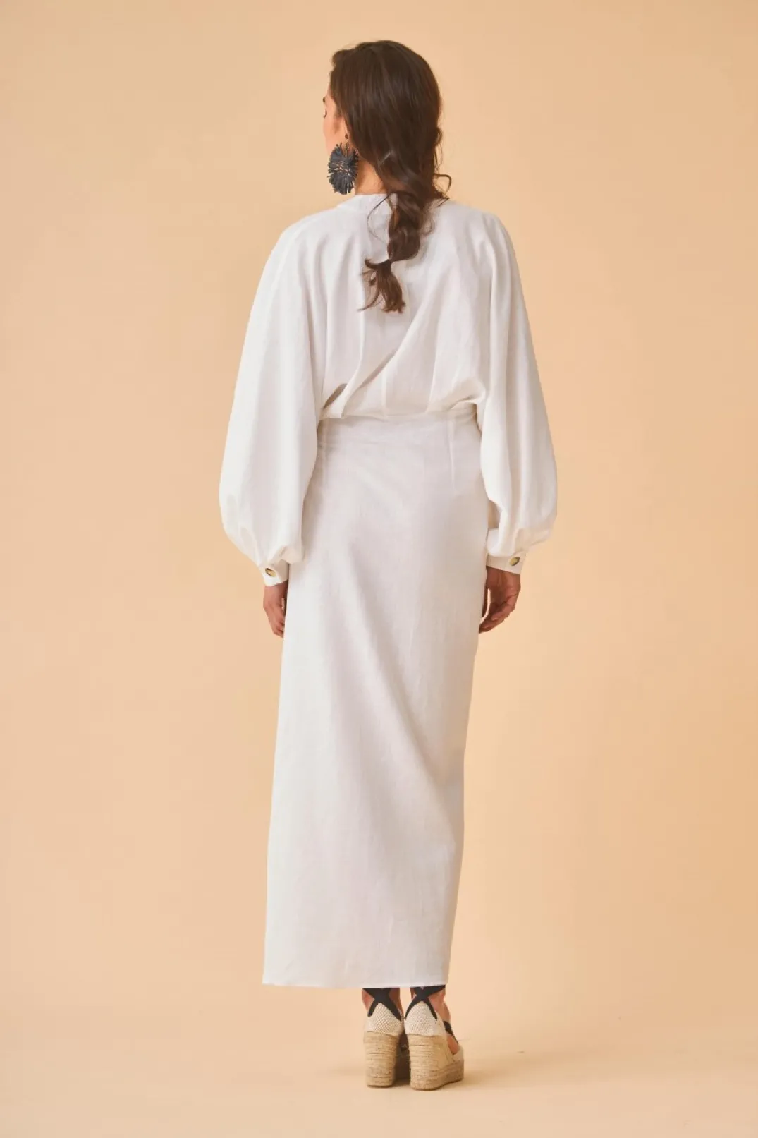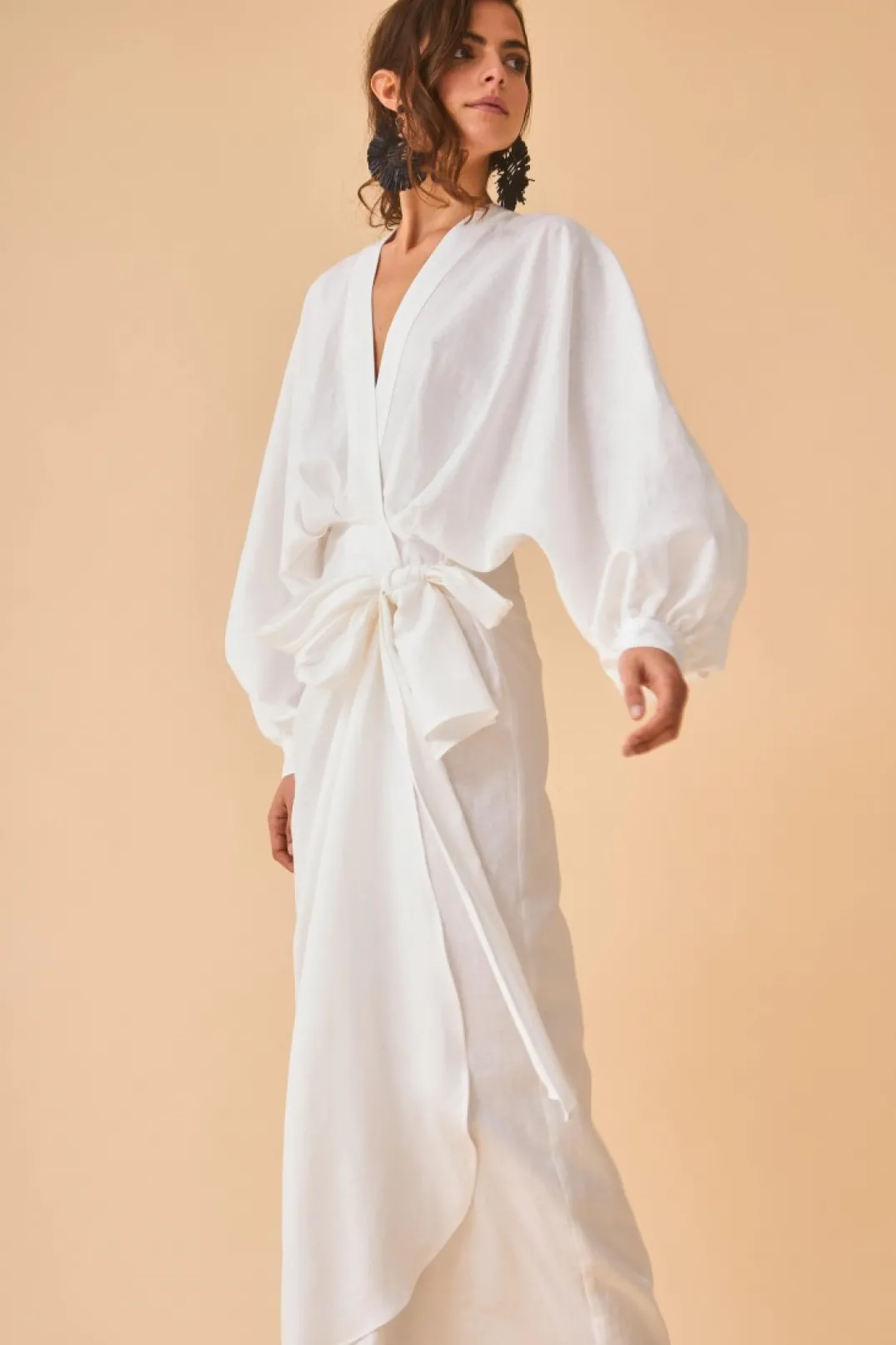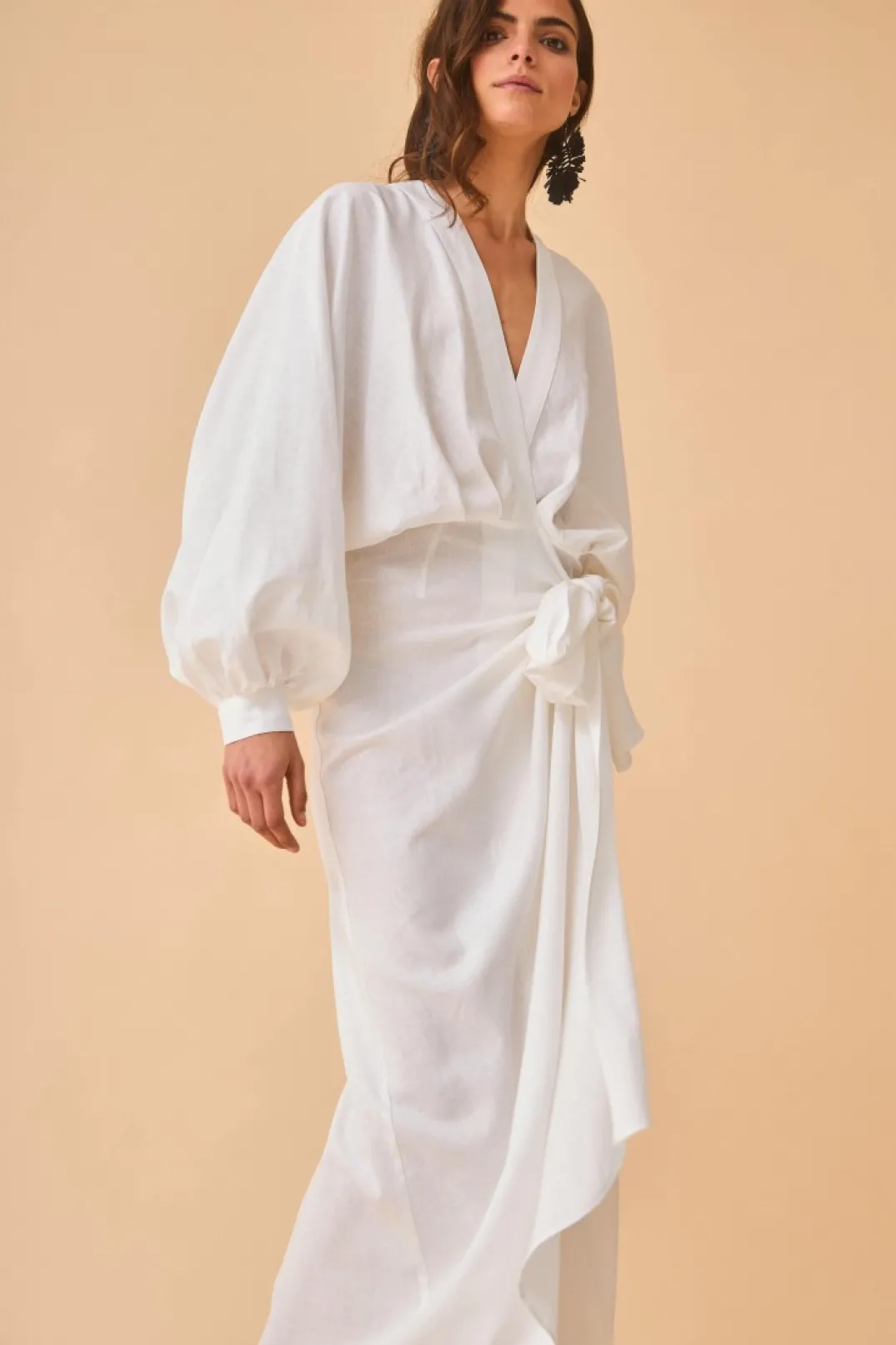 Vestido confeccionado en tejido mezcla lino color blanco. Escote en pico cruzado y manga abullonada, puños con botón a contraste estilo carey. Corte en la cintura y falda estilo pareo con lazada lateral.