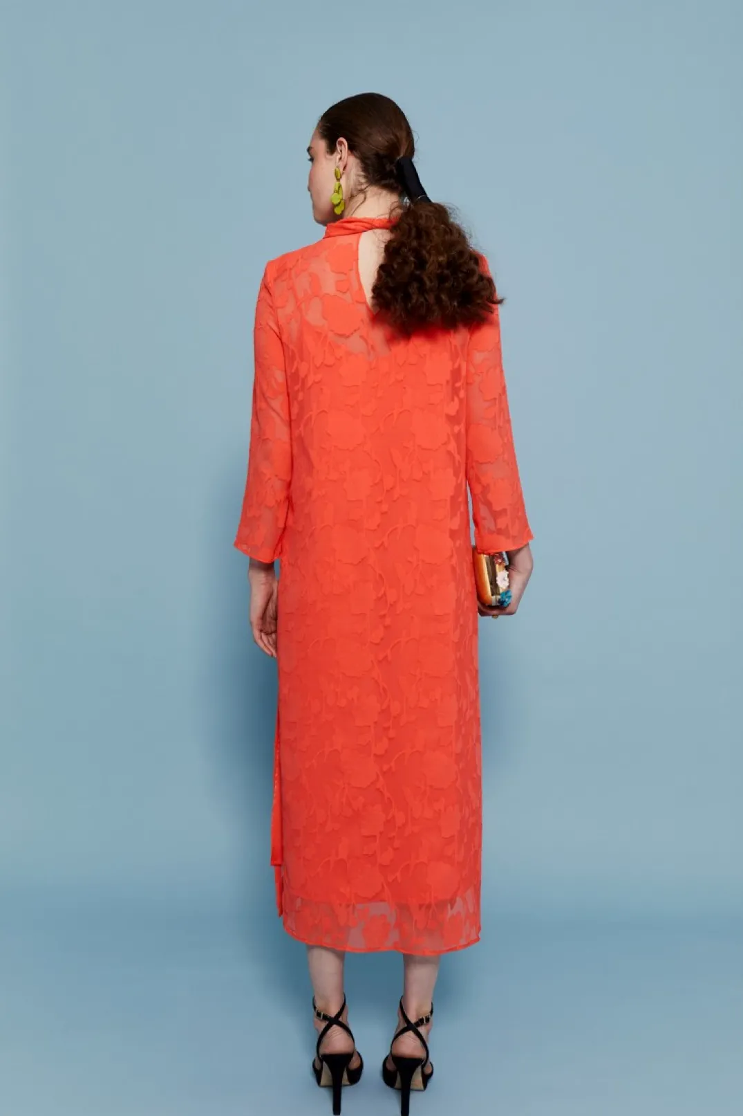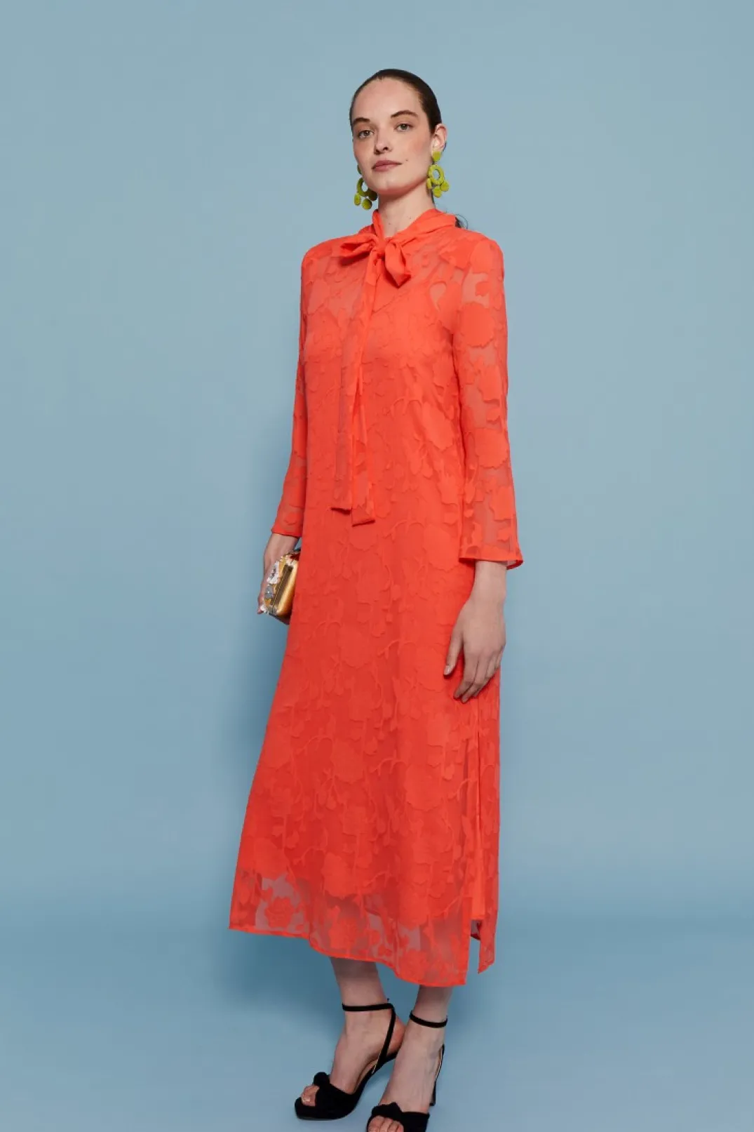 Vestido de fiesta dos piezas color coral flúor. Vestido interior de tirante fino confeccionado en tejido color coral y casaca confeccionada en gasa a tono. Cuello perkins con maxi lazada multiposición. Incluye hombreras forradas en el mismo tejido.