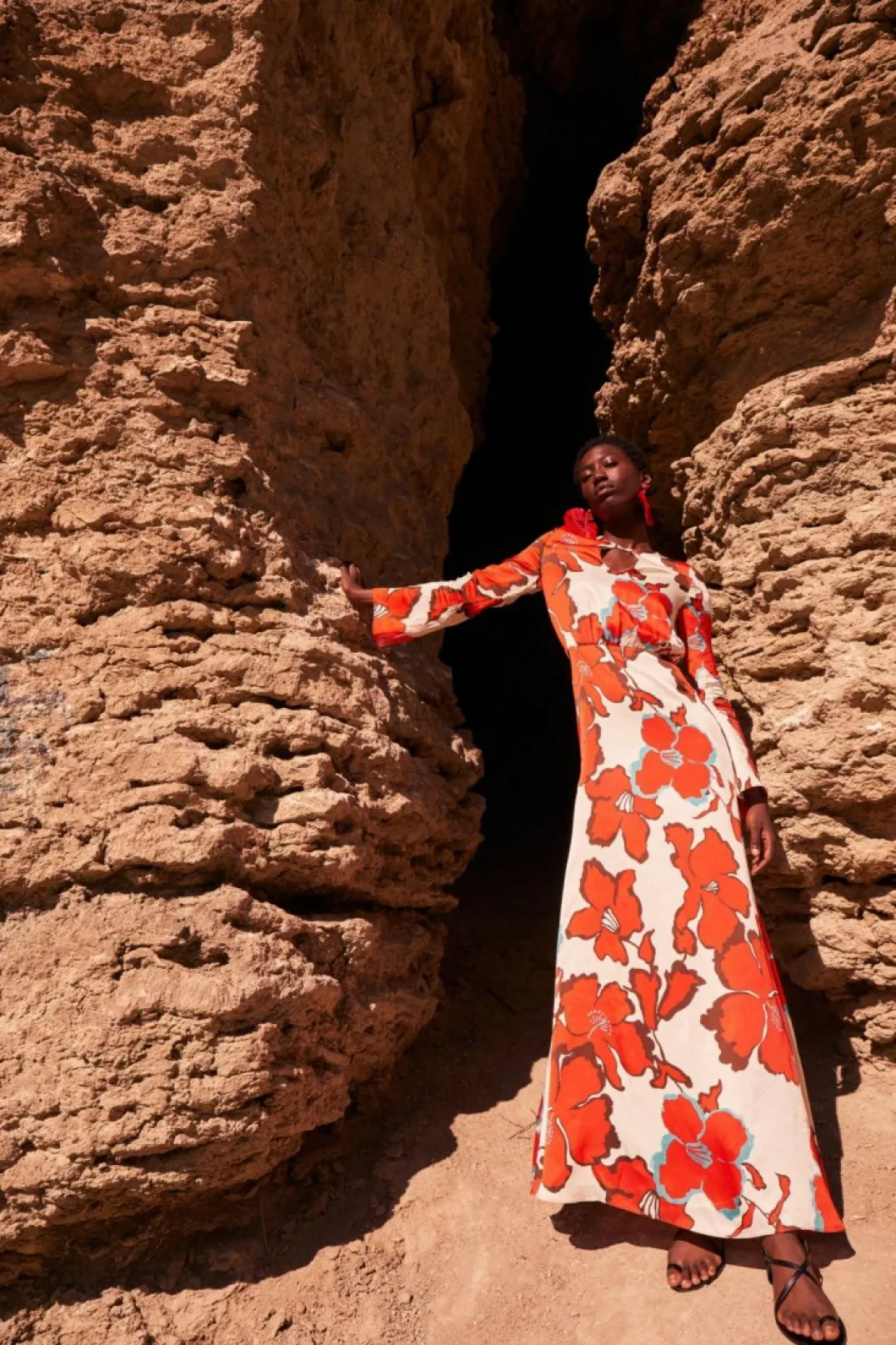 Vestido confeccionado en tejido satinado con estampado de flores en tonos rojo y aguamarina. Cuello redondo con escote en forma de lágrima. Manga larga y corte en la cintura. Cierre con cremallera trasera invisible