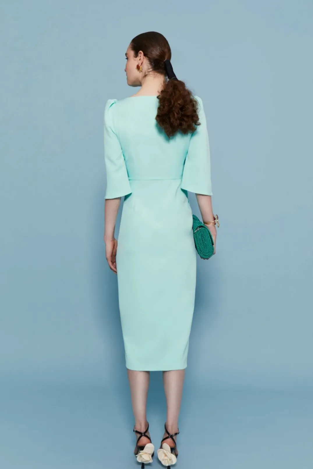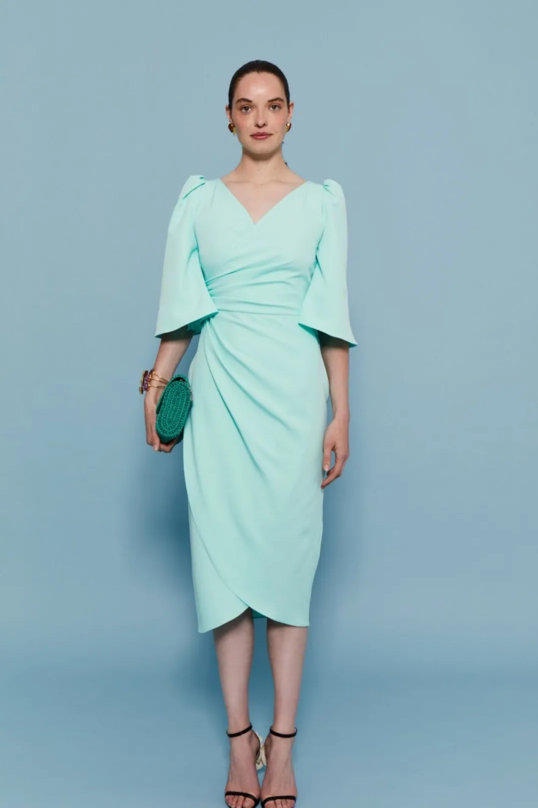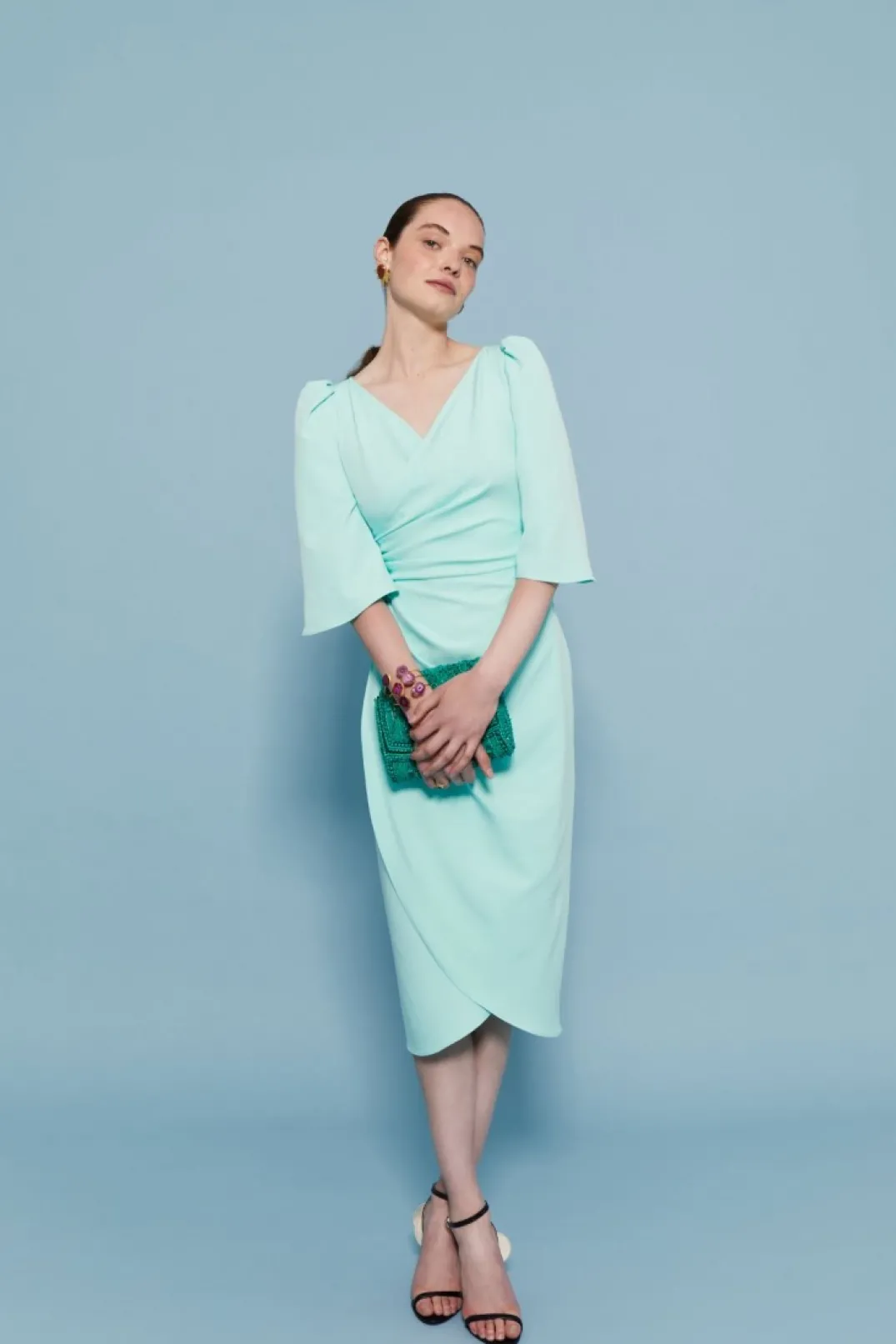 Vestido midi de fiesta confeccionado en crepe aguamarina. Escote cruzado terminado en drapeado a la cintura. Manga estilo mariposa.