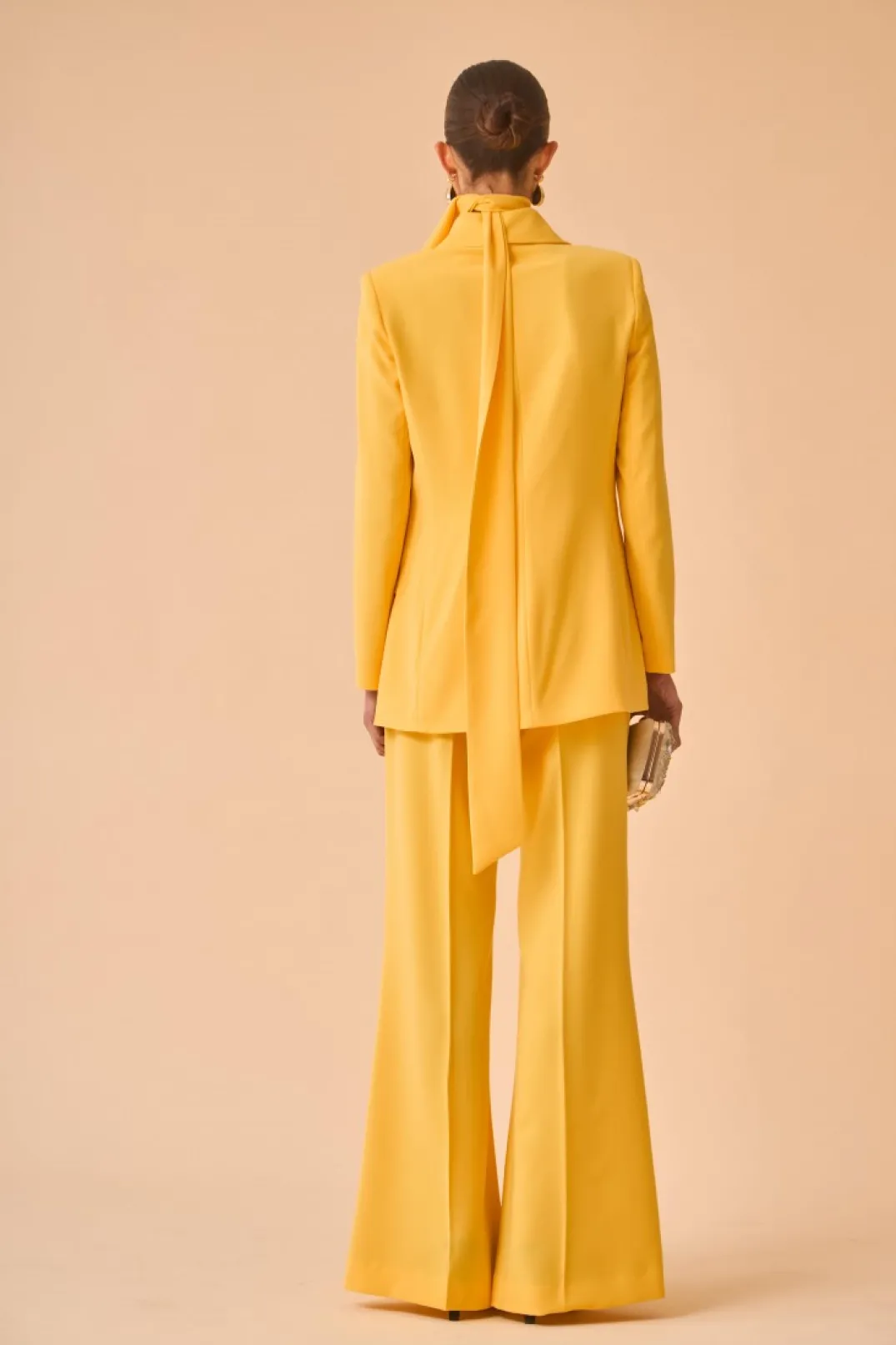 Blazer confeccionada en crepe amarillo. Corte entallado con hombreras y manga larga. Cierre frontal con botones forrados en el mismo tejido.