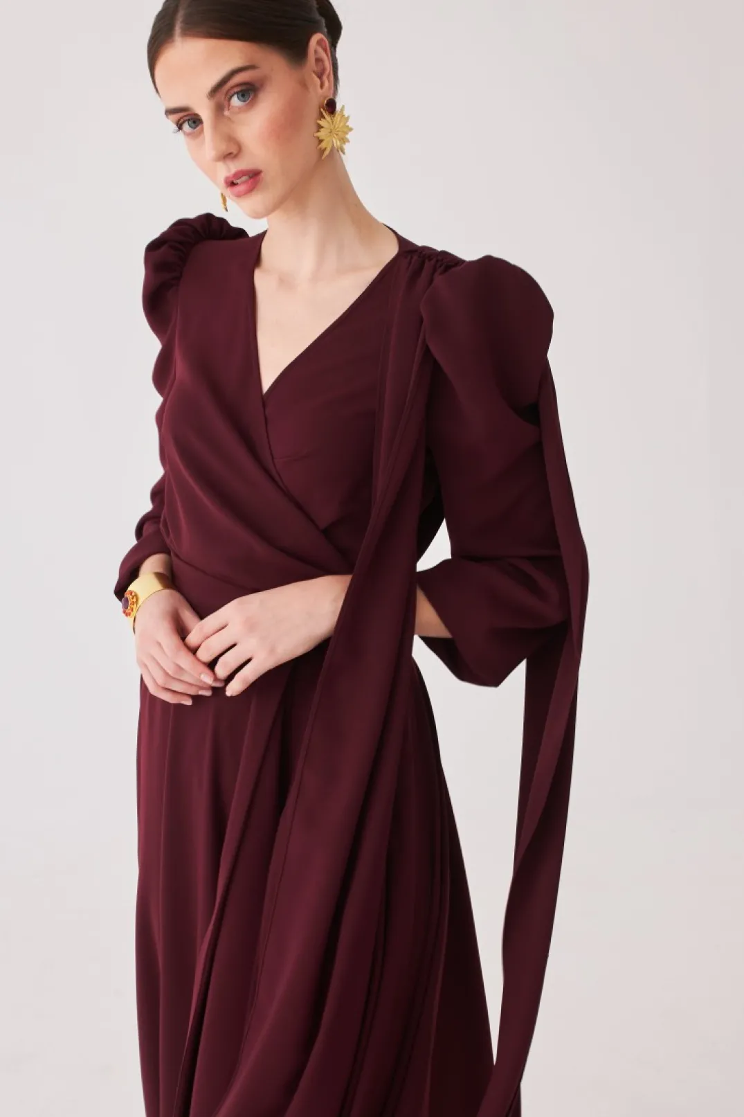 Top confeccionado en crepe color burdeos. Manga francesa abullonada con efecto capa delantero y trasero. Escote cruzado y cierre lateral con lazada a tono.