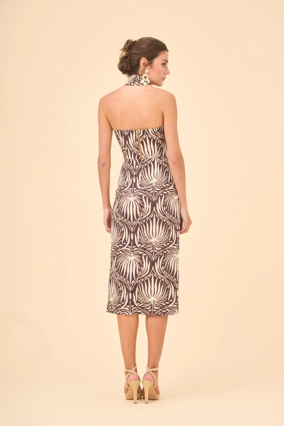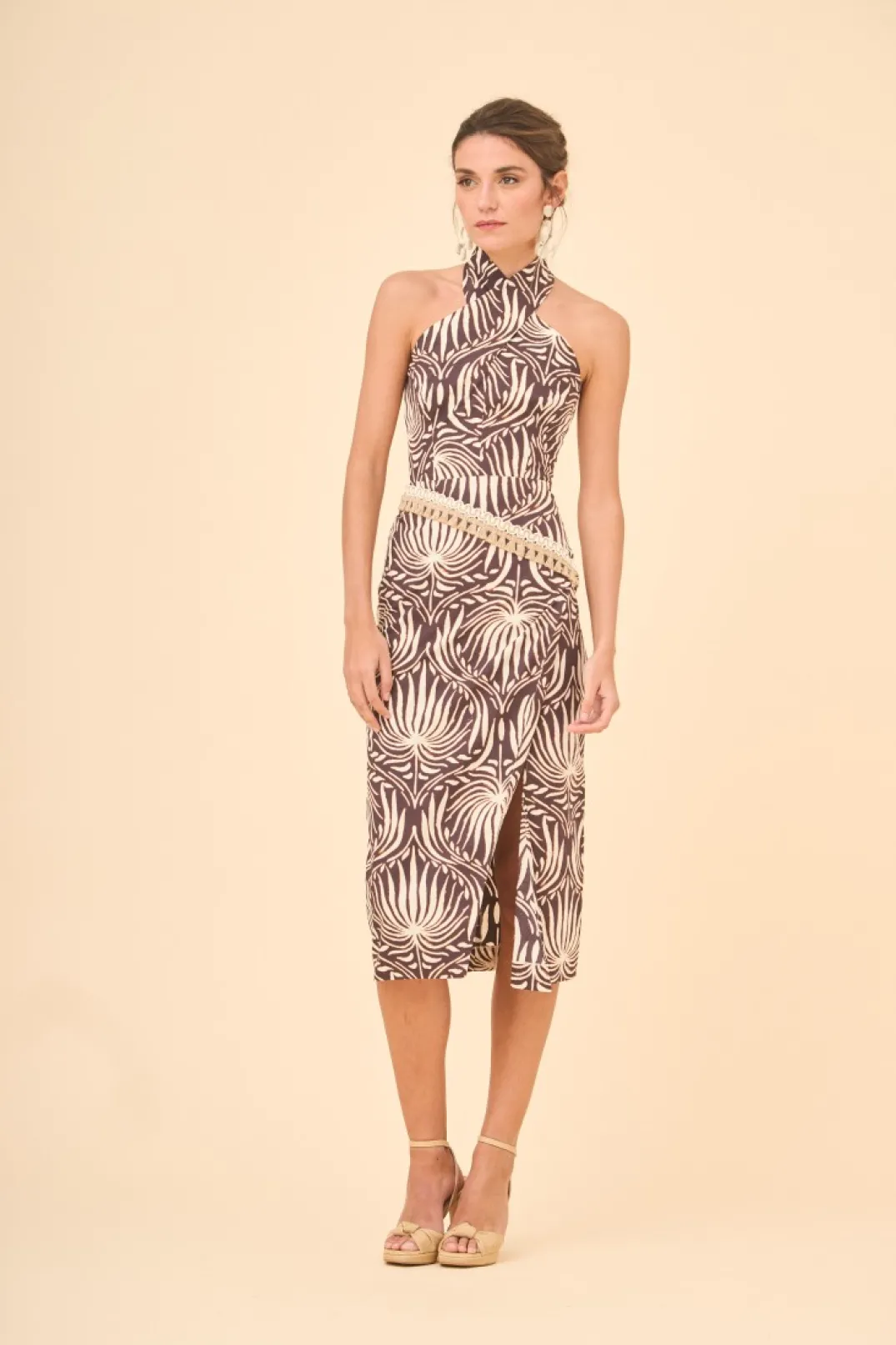 Falda estilo tulipa confeccionada en algodón estampado estilo animal print. Largo midi, corte en la cintura con pasamanería de rafia y abertura delantera. Cierre con cremallera invisible trasera.