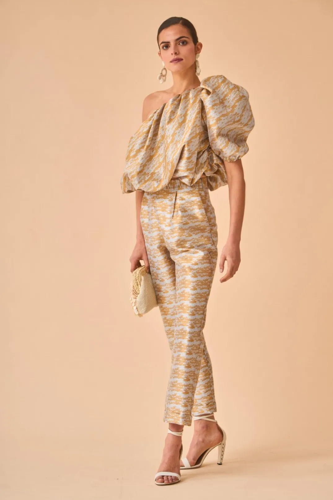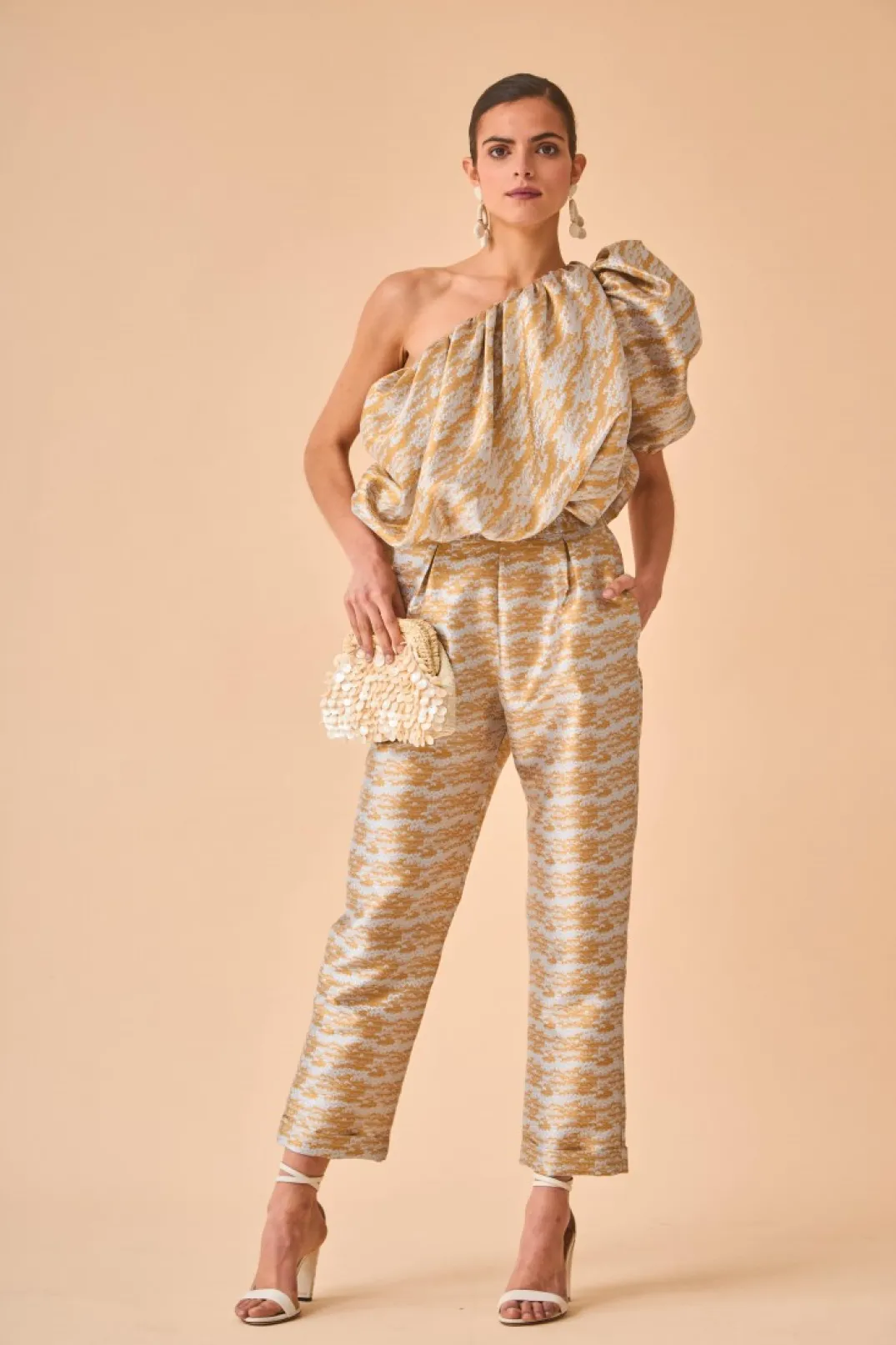 Pantalón confeccionado en tejido metalizado. Tiro alto y corte recto con bolsillos laterales. Consigue un total look perfecto y super original combinándolo con nuestro top Aarte.