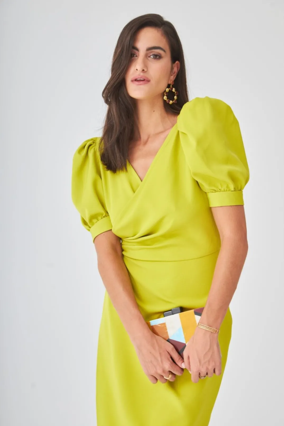 Vestido de fiesta confeccionado en crepe oliva. Escote cruzado terminado en fruncido a la cintura. Manga corta abullonada. Falda estilo tulipa.