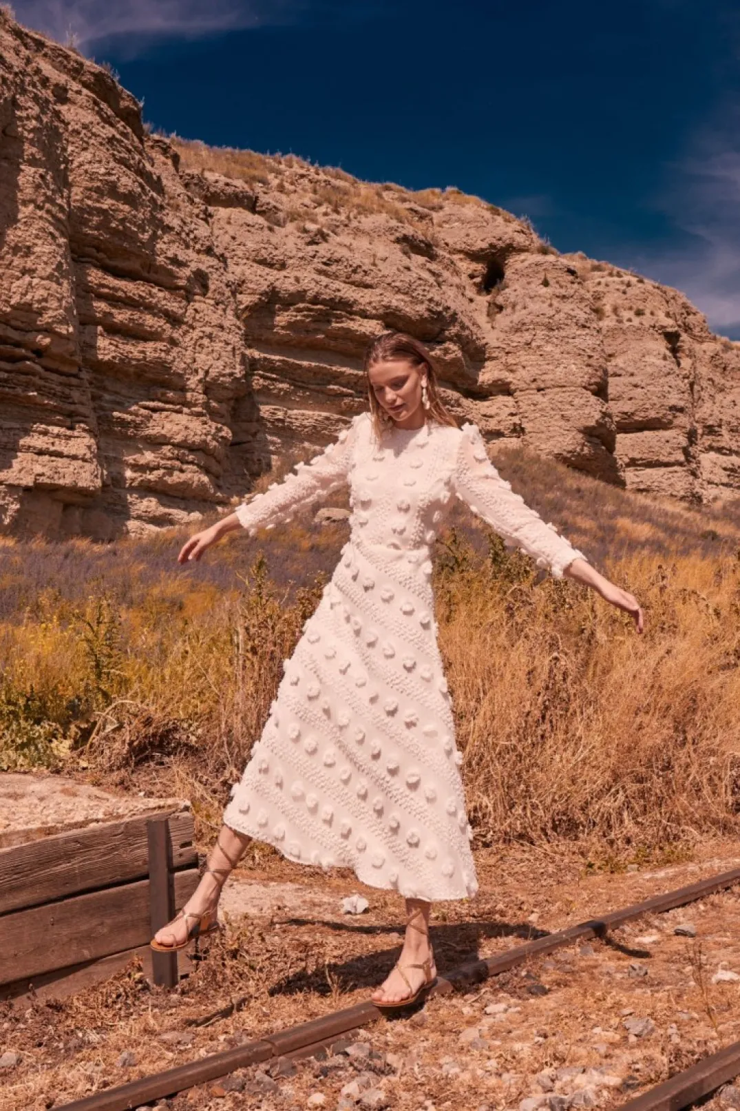 Vestido de fiesta confeccionado en organza con flores en el mismo tejido. Cuello redondo y manga larga. Corte en la cintura y falda midi con vuelo. Cierre trasero con cremallera invisible. Incluye forro a tono.