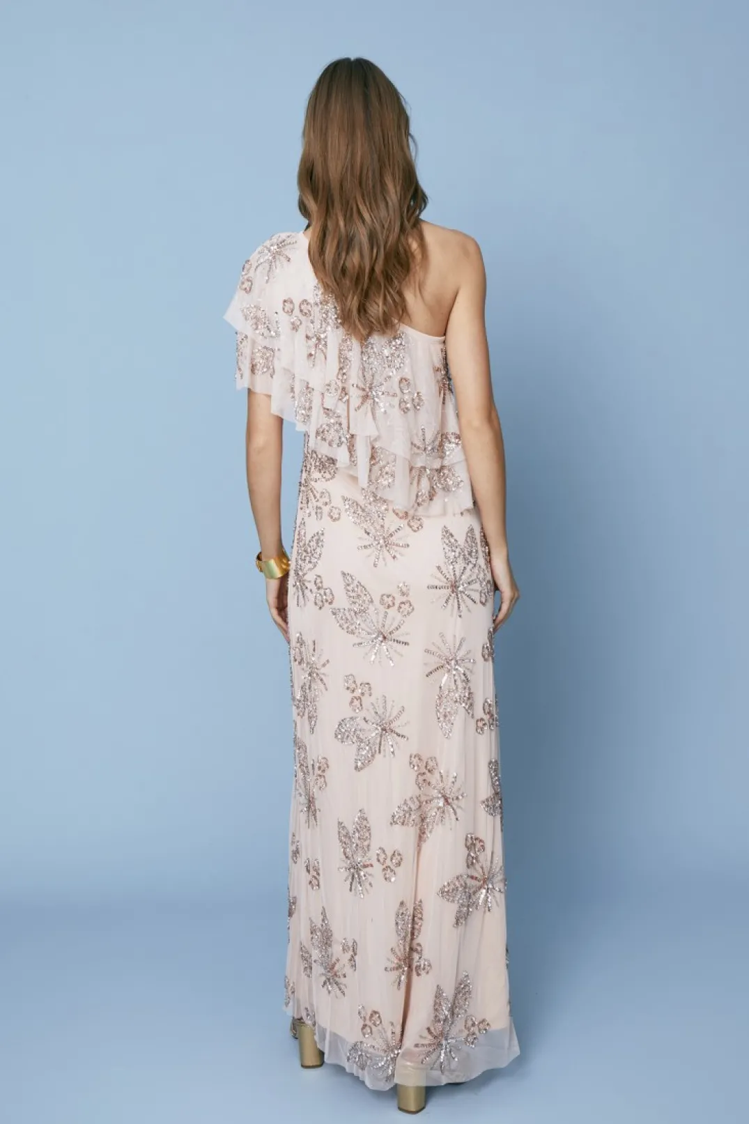 Este sofisticado vestido largo de fiesta asimétrico es la elección perfecta para eventos especiales. Confeccionado en un tono rosa, este vestido presenta un diseño de un solo hombro con un elegante volante que añade un toque de romanticismo y feminidad. Las lentejuelas delicadamente bordadas en patrones florales sobre la tela ligera crean un efecto romántico y original. La falda fluida cae suavemente hasta el suelo, ofreciendo un movimiento elegante y cómodo.