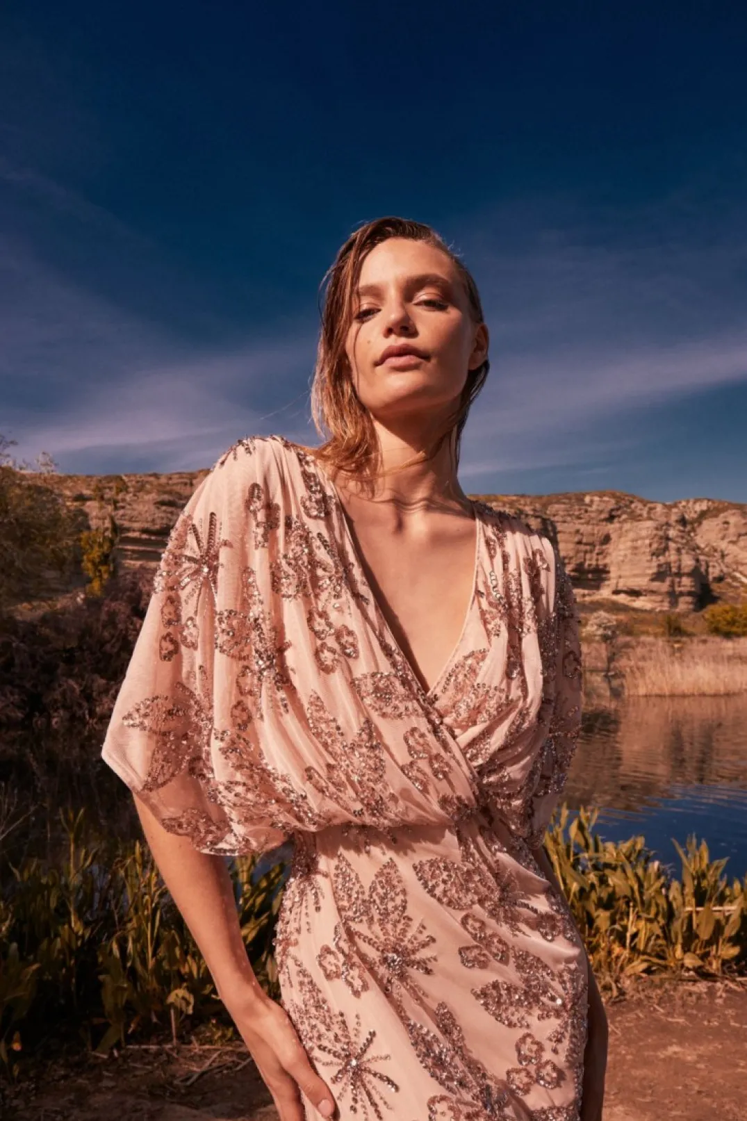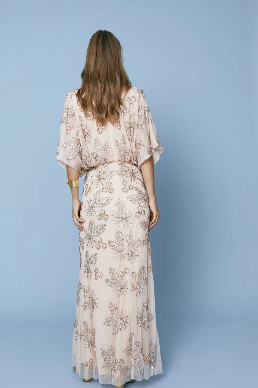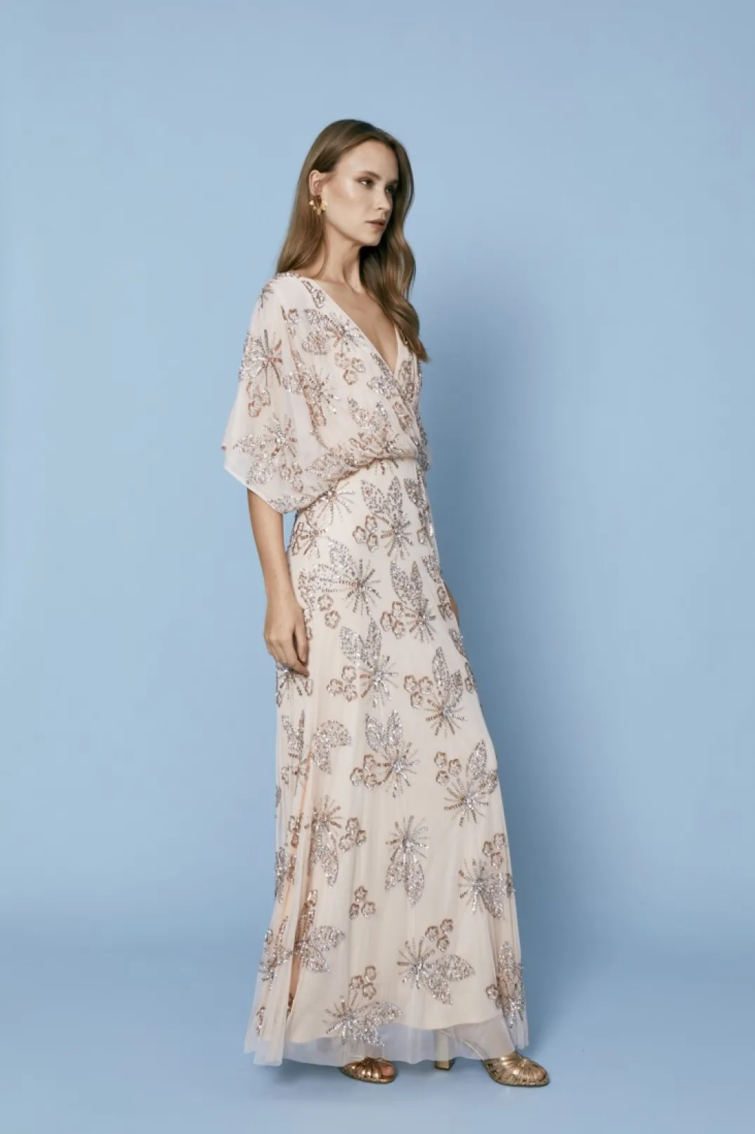 Vestido largo de fiesta con lentejuelas. Confeccionado en un tono rosa suave, este vestido presenta un escote en pico cruzado que aporta un toque de elegancia y modernidad. Las mangas cortas y sueltas ofrecen comodidad y un estilo relajado. El diseño está adornado con lentejuelas bordadas en patrones florales, creando un efecto romántico y original. La falda fluida cae suavemente hasta el suelo, ofreciendo un movimiento elegante y cómodo, perfecto para bailar toda la noche.