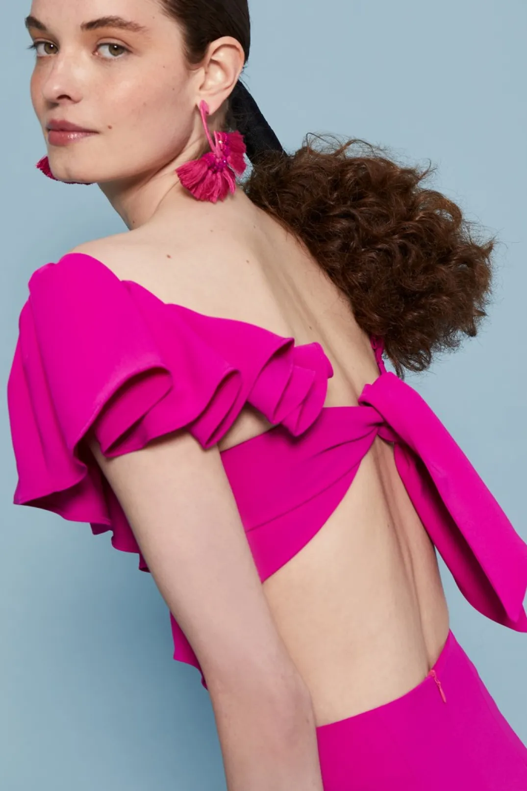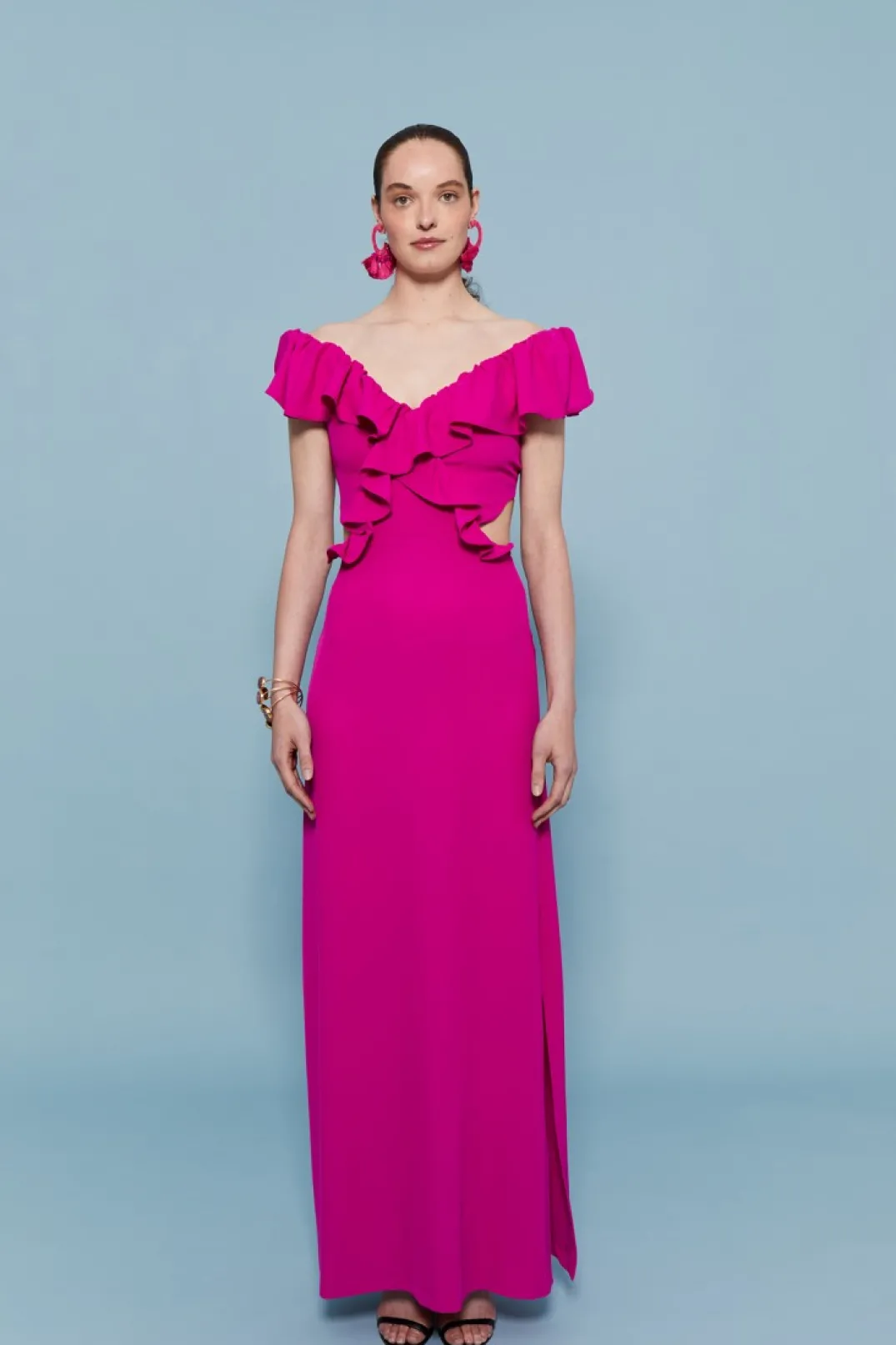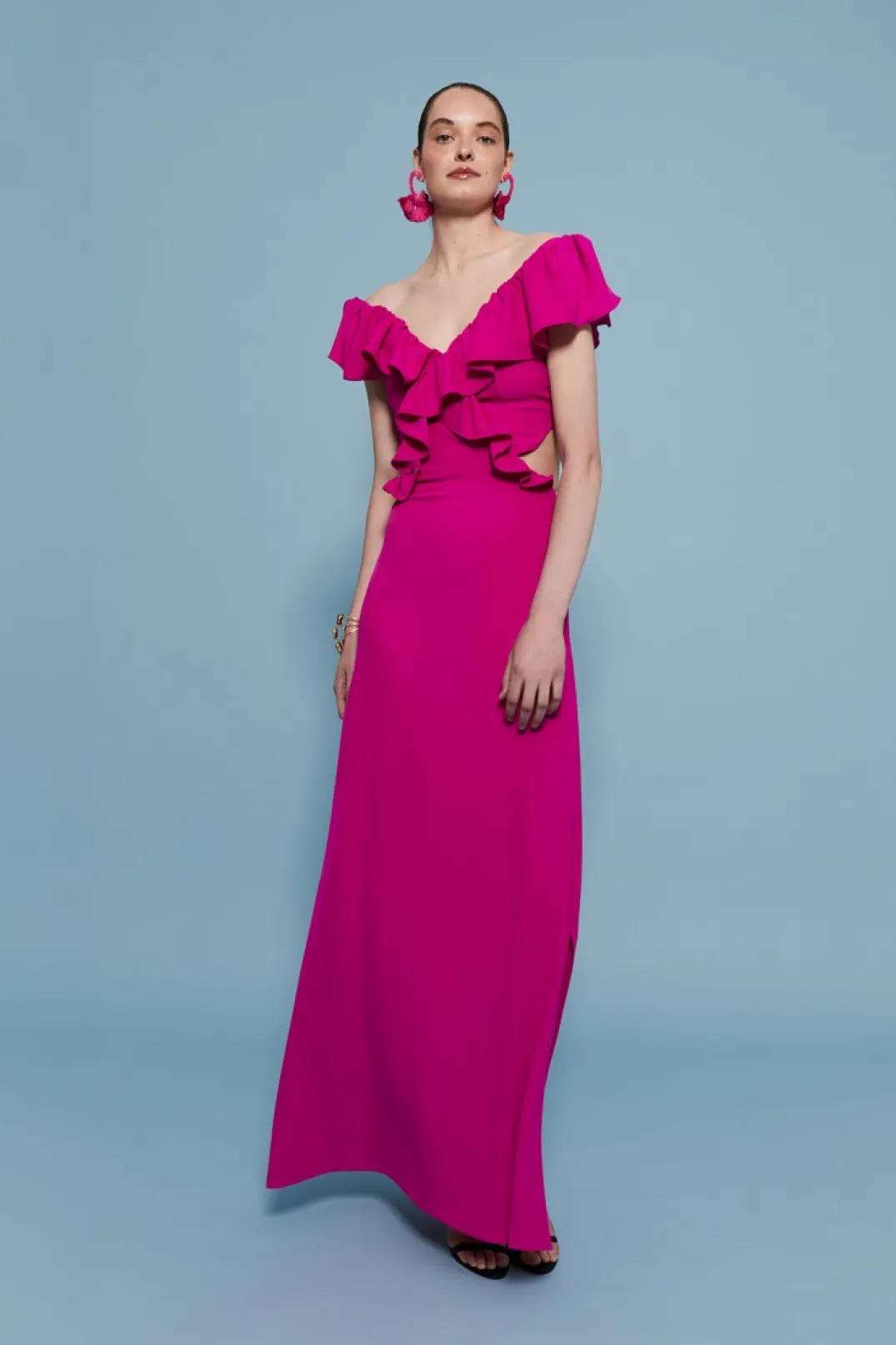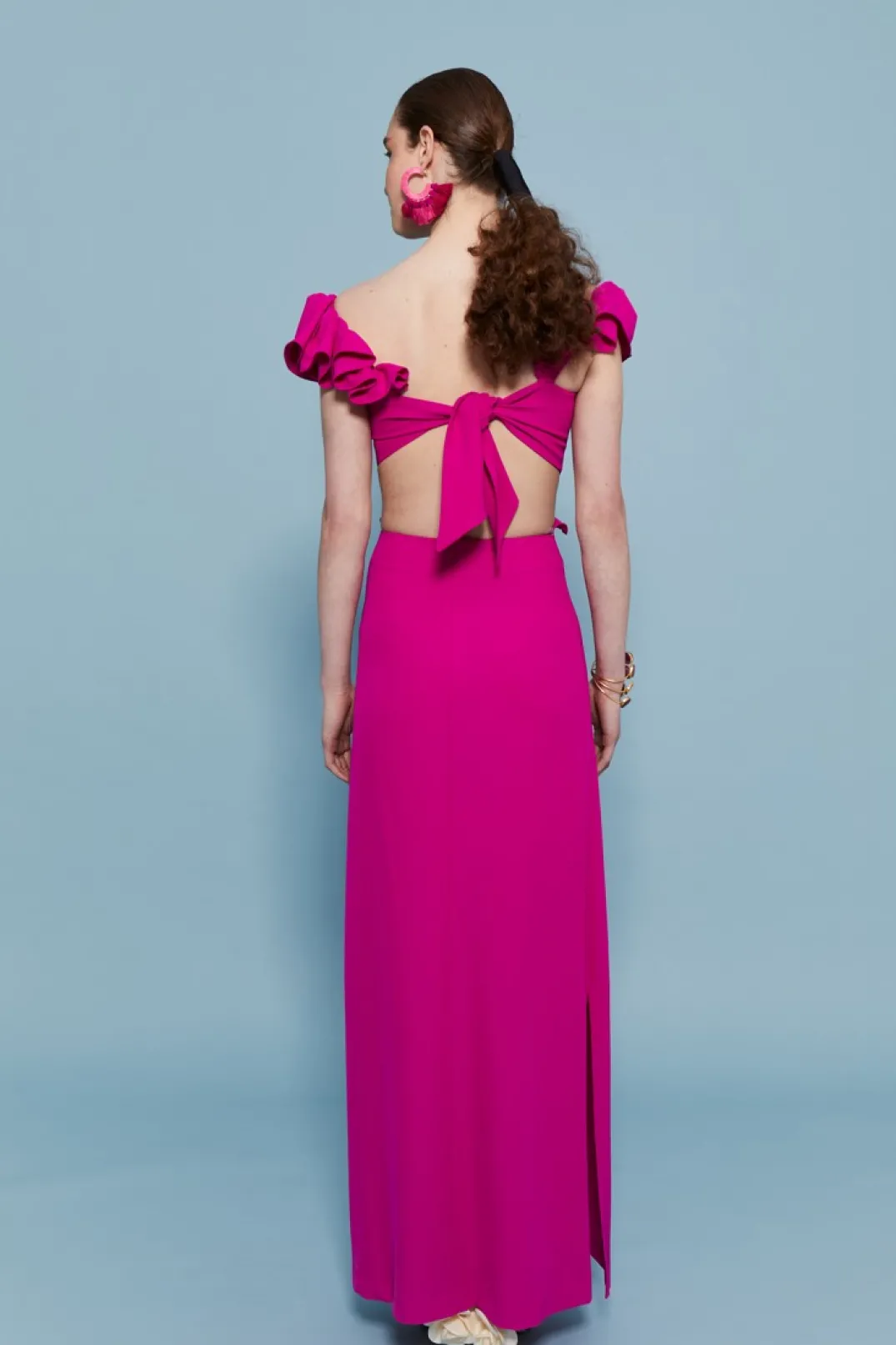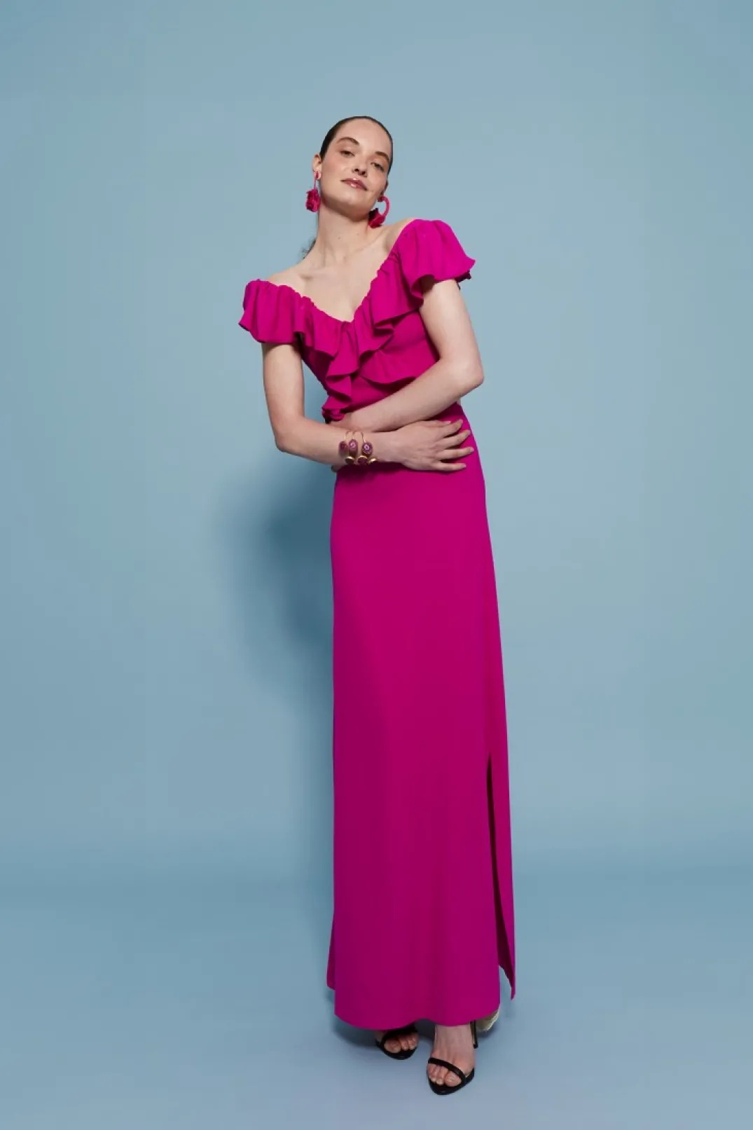 Vestido de fiesta largo confeccionado en crepe color buganvilla. Escote en V y corte a la cintura. Tirante ancho con volante. Corte en la cintura, corte recto y aberturas laterales. Abertura en la espalda y cierre con maxi lazada.
