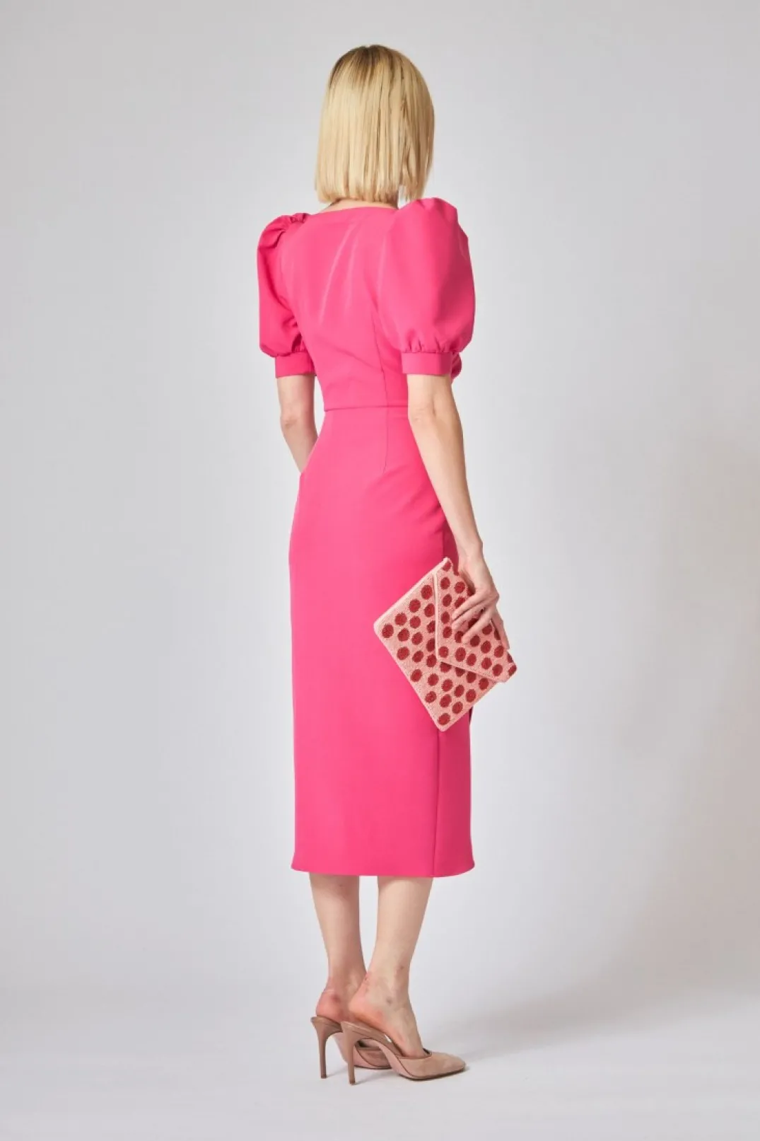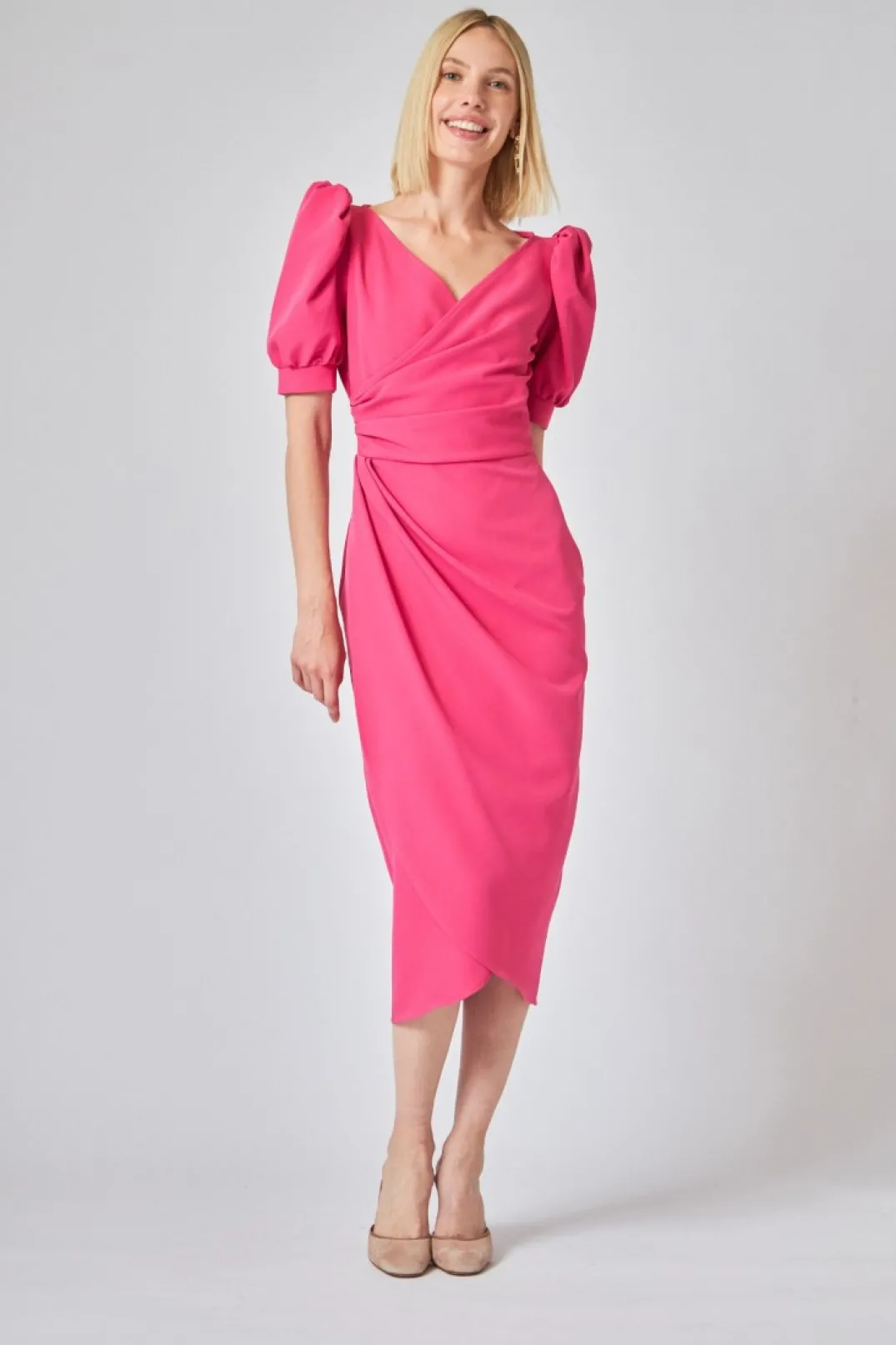 Vestido de fiesta confeccionado en crepe fucsia. Escote cruzado terminado en fruncido a la cintura. Manga corta abullonada. Falda estilo tulipa.
