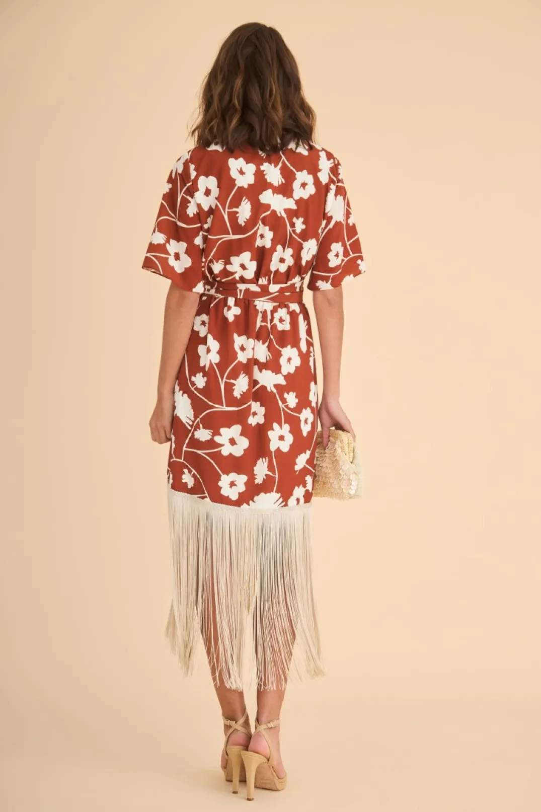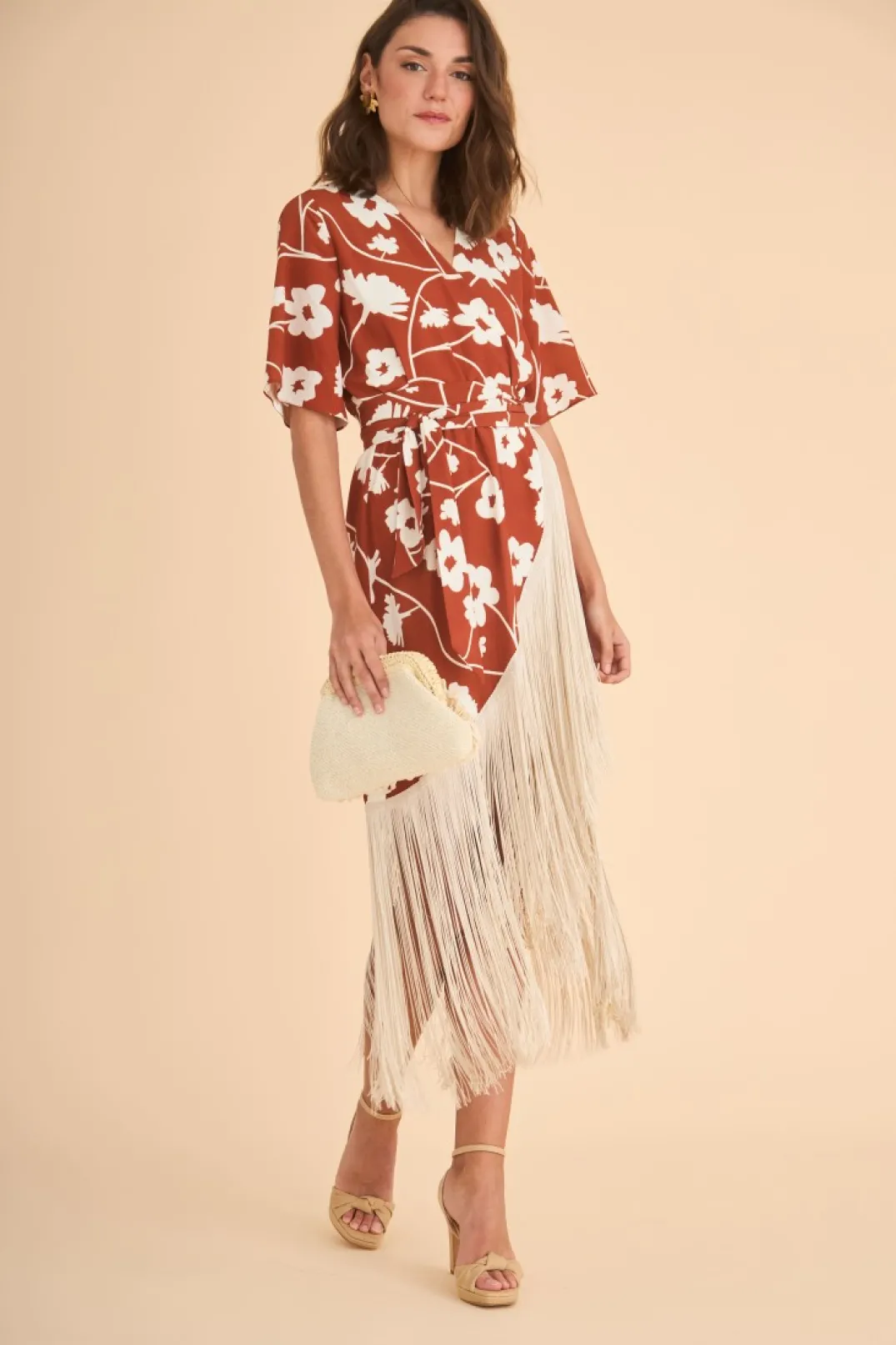 Vestido de fiesta confeccionado en tejido satinado en tono marrón. Escote cruzado y corte a la cintura con cinturón. Manga corta. Falda estilo pareo con flecos y forro a tono.
