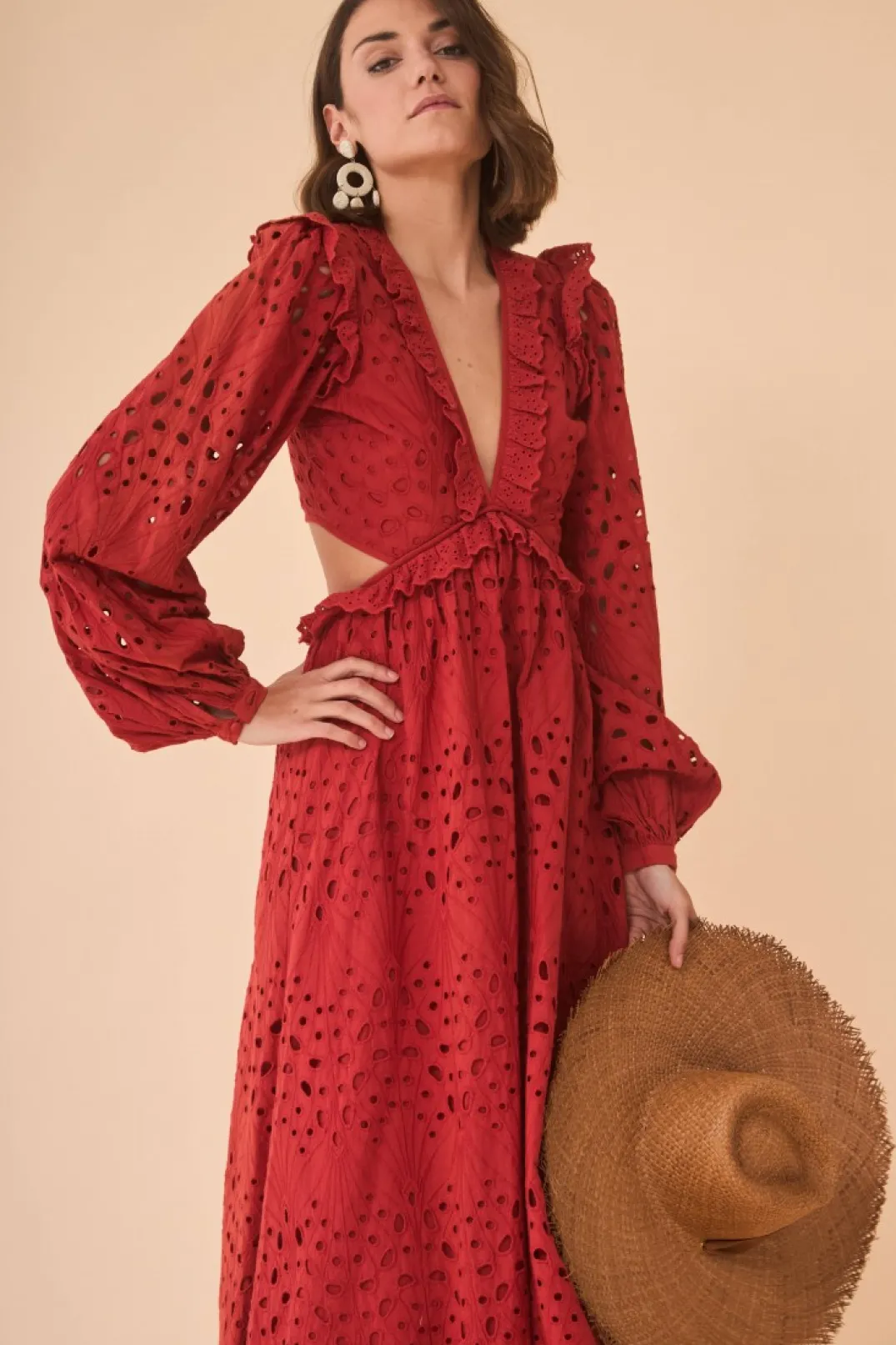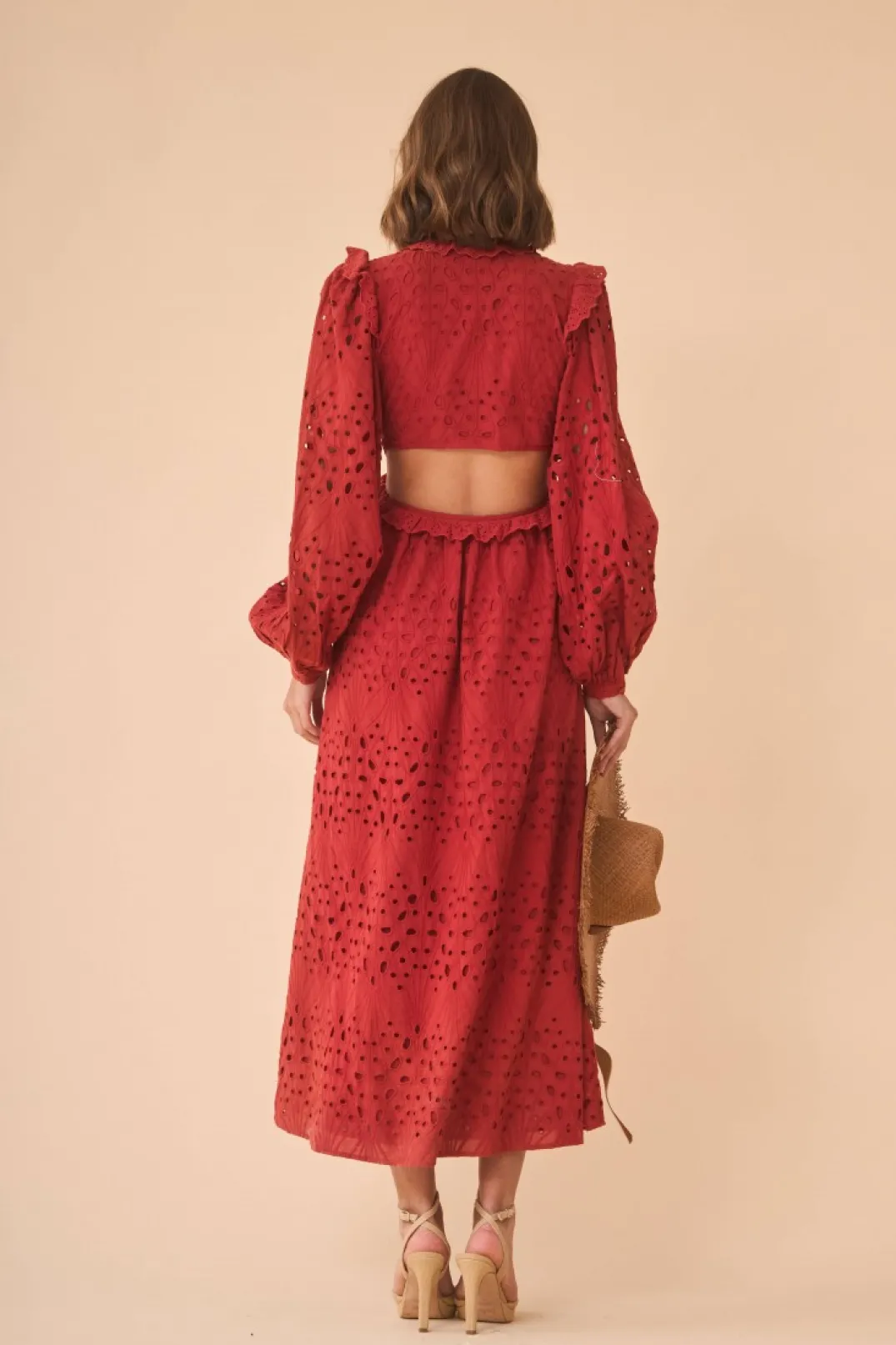 Vestido confeccionado tejido troquelado en color teja. Escote en pico con mini volante y manga larga abullonada con elástico en el puño. Corte cut-out y falda midi con vuelo. Cierre con cremallera invisible lateral.