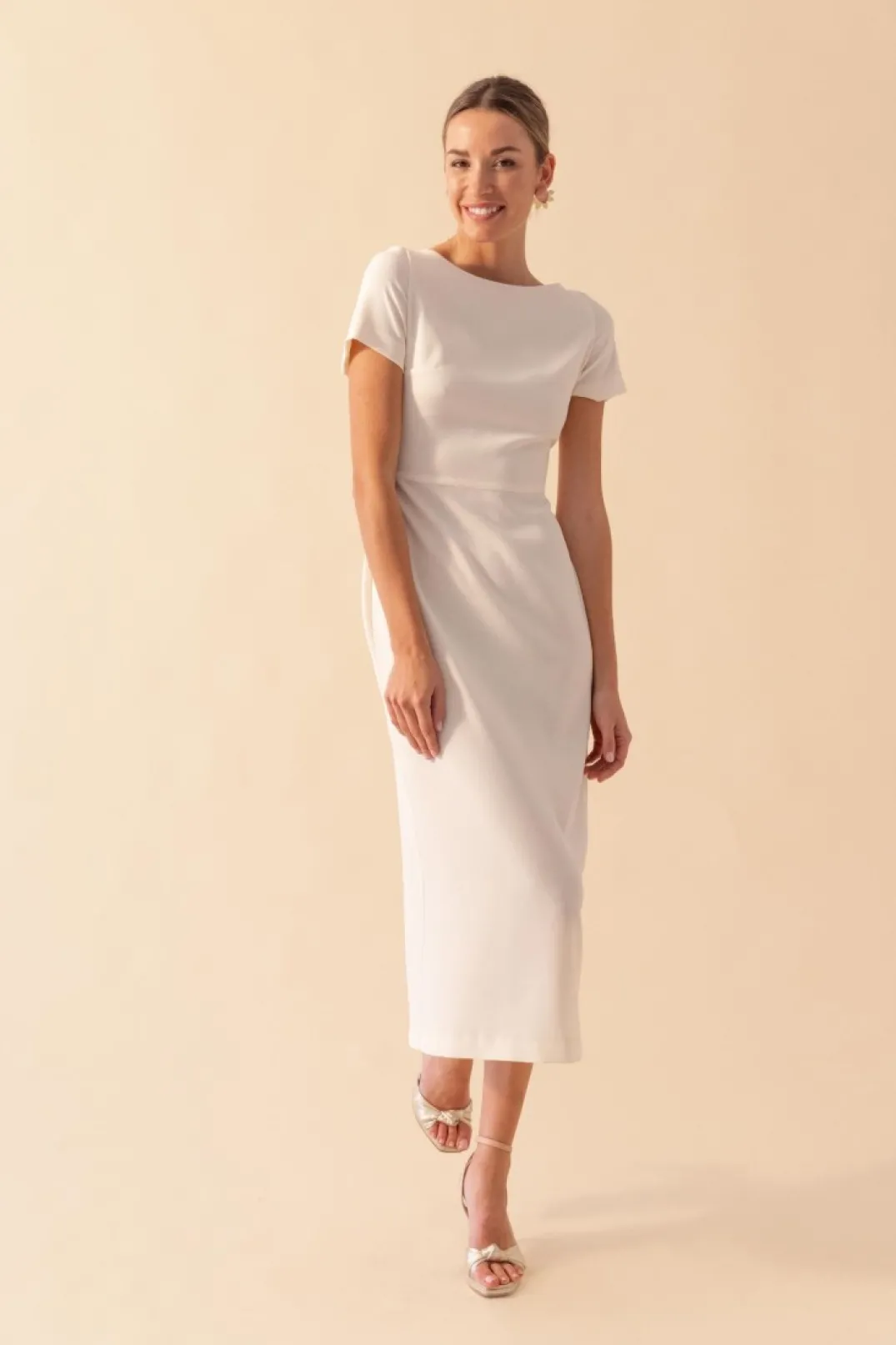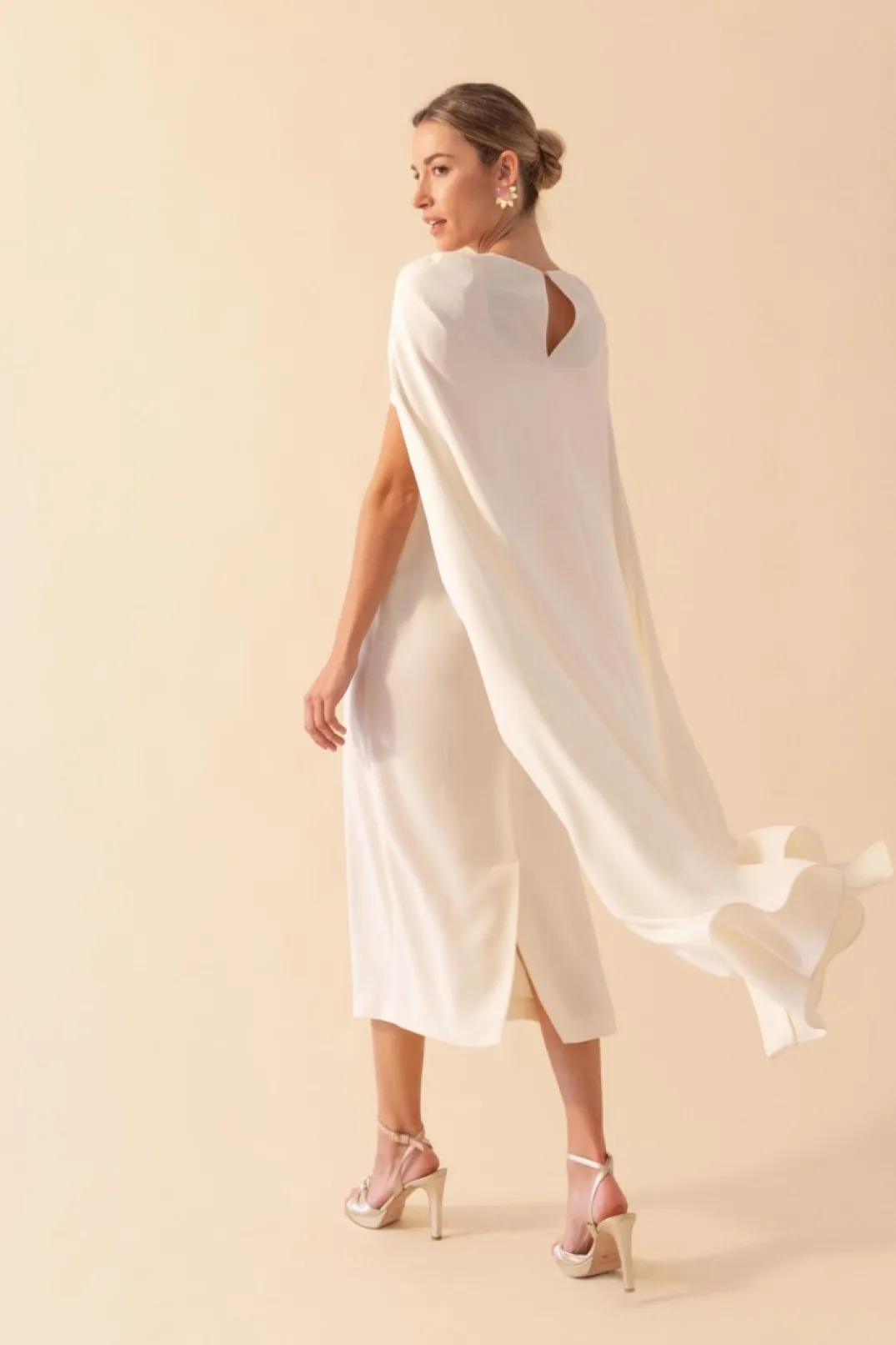 Vestido confeccionado en crepe blanco. Escote barco y manga corta. Corte en la cintura y falda recta con abertura trasera. Incluye capa en el mismo tono.