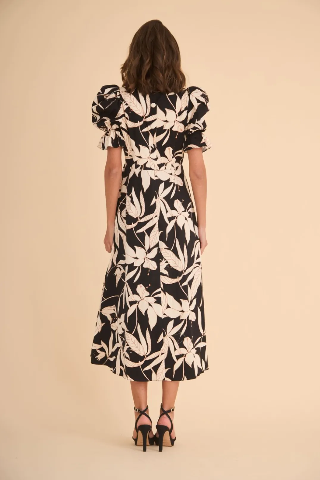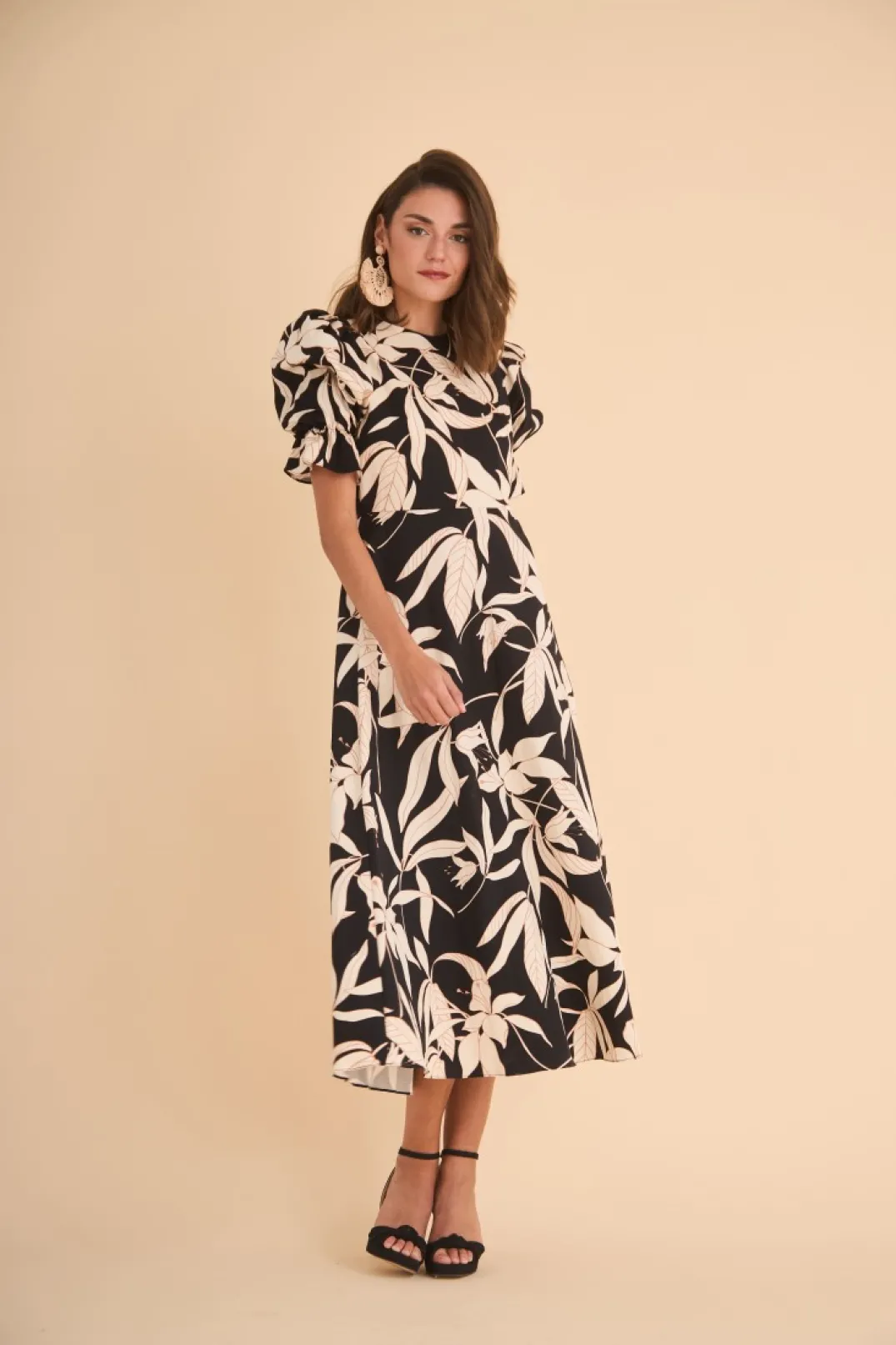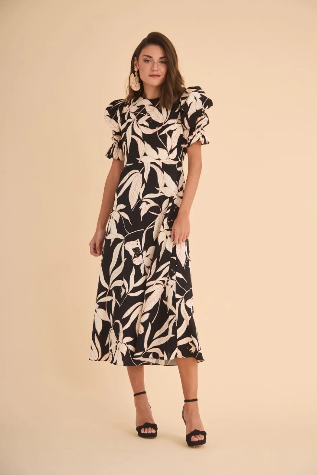 Vestido de fiesta confeccionado en tejido de algodón estampado en tono negro y crudo. Cuello redondo y manga corta abullonada. Corte en la cintura y largo midi con vuelo. Cierre trasero con botones forrados a tono. Perfecto para combinar con accesorios dorados, ¡nos encanta!