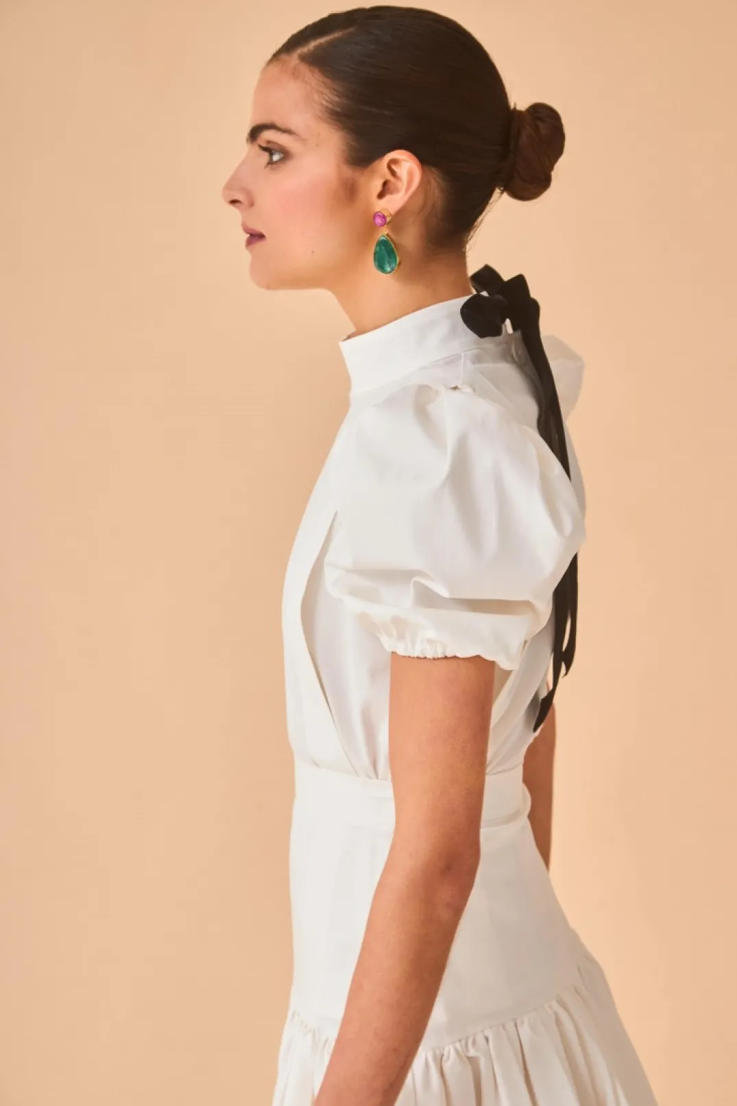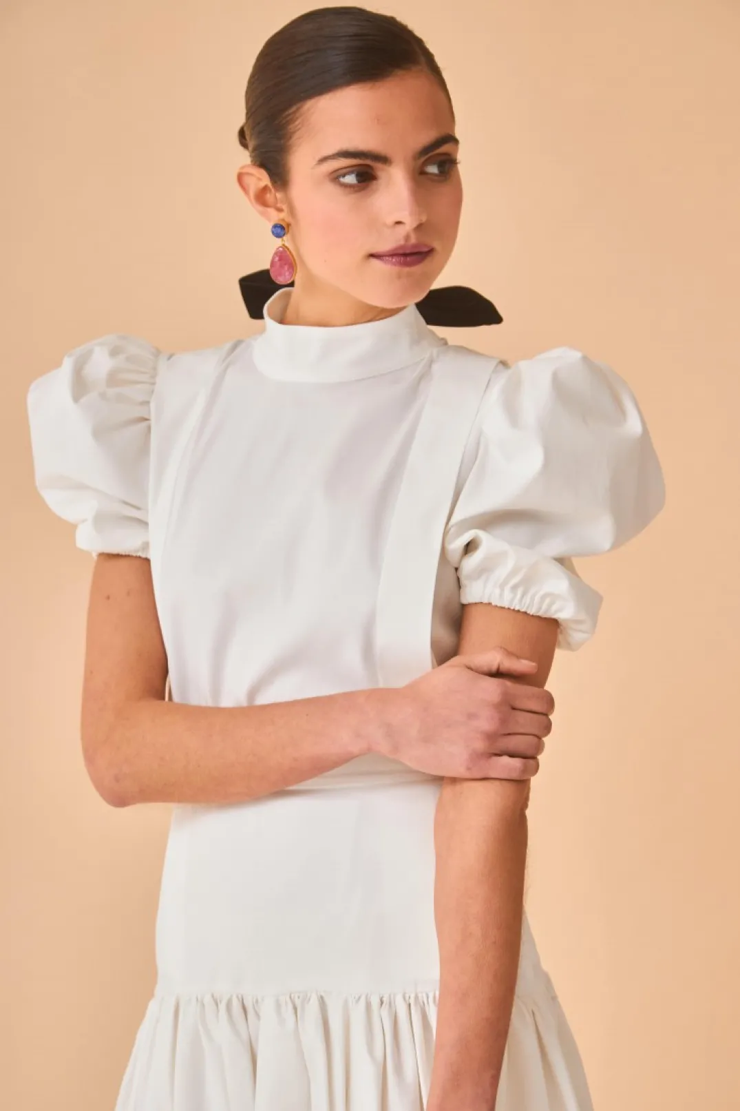 Top confeccionado en algodón color blanco. Cuello perkins, solapas laterales y manga corta abullonada con elástico. Cierre trasero con botones y lazo de terciopelo en color negro.