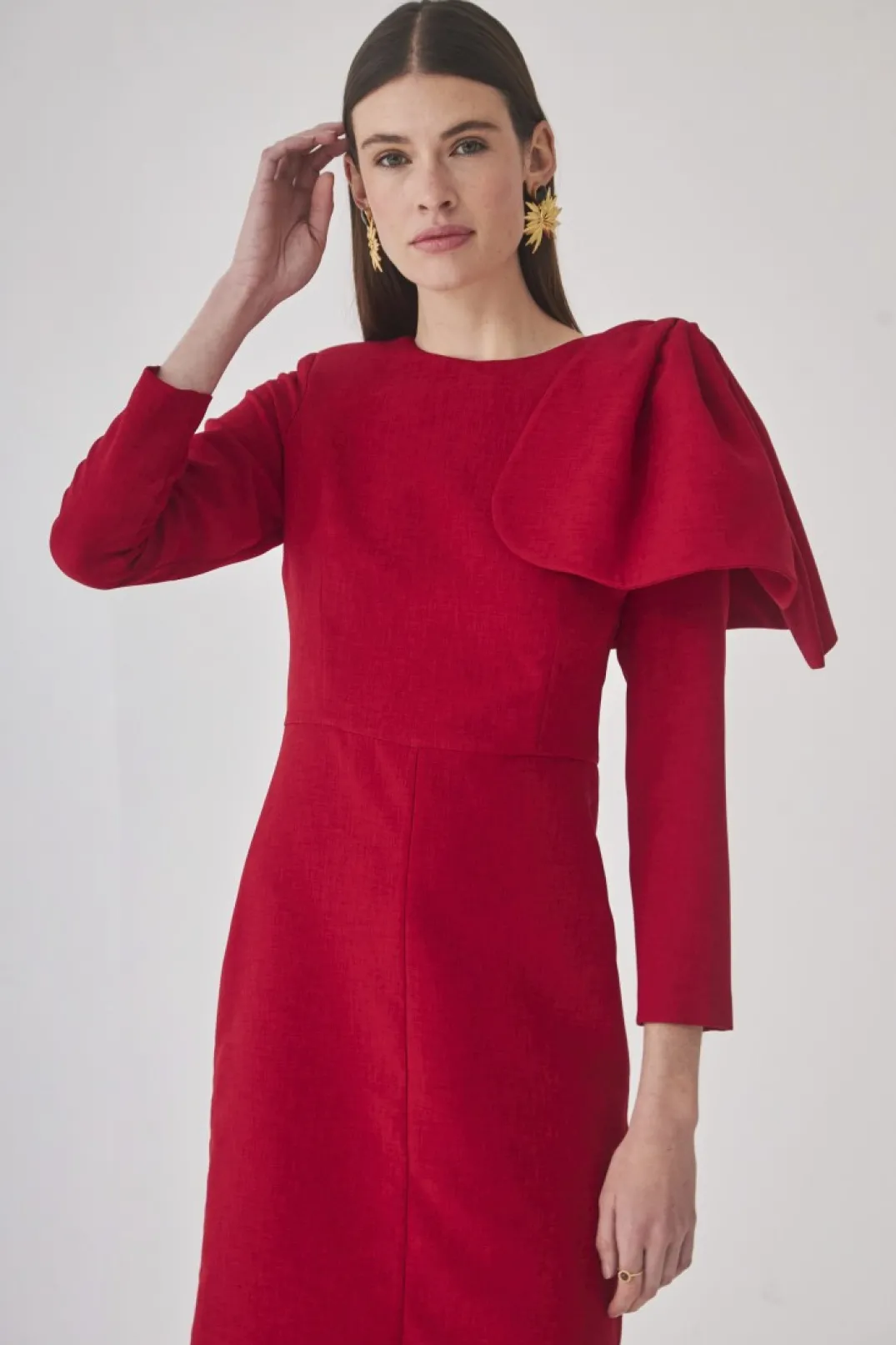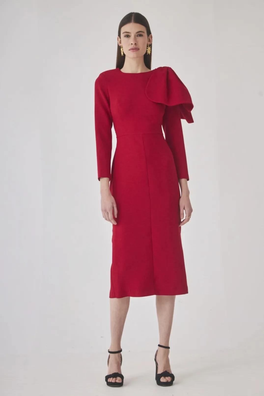Vestido midi de fiesta confeccionado tejido color rojo. Escote redondo con detalle de lazo confeccionado en el mismo tejido. Fruncido a la cintura y manga larga abullonada. Falda midi ajustada con abertura trasera. Cierre con cremallera invisible