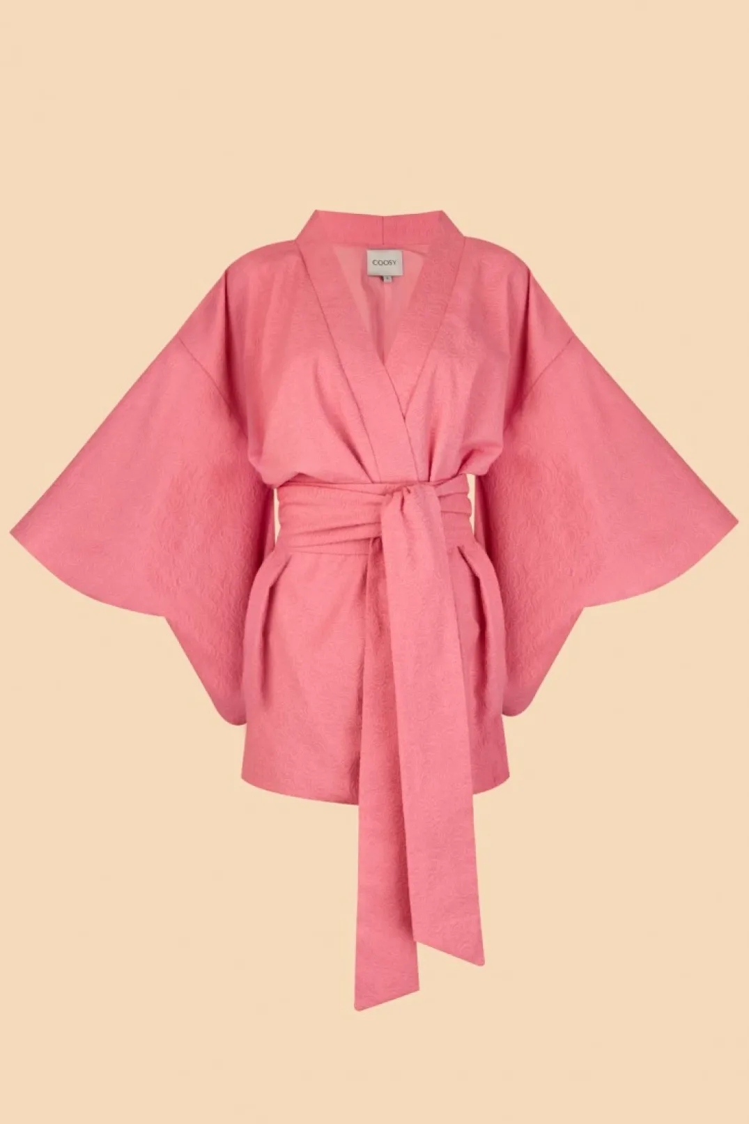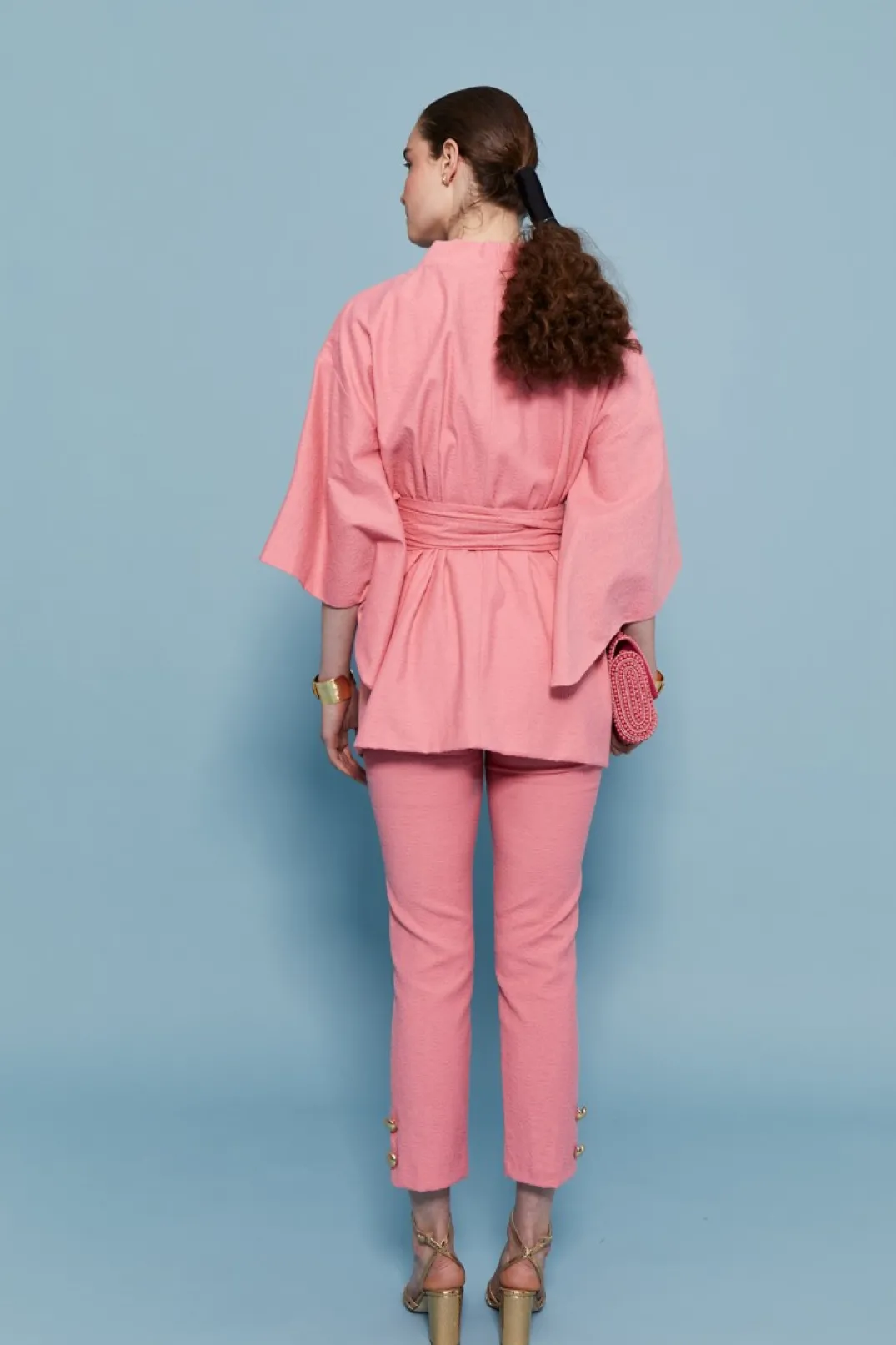 Kimono confeccionado en tejido rosa. Manga japonesa y forro a tono.