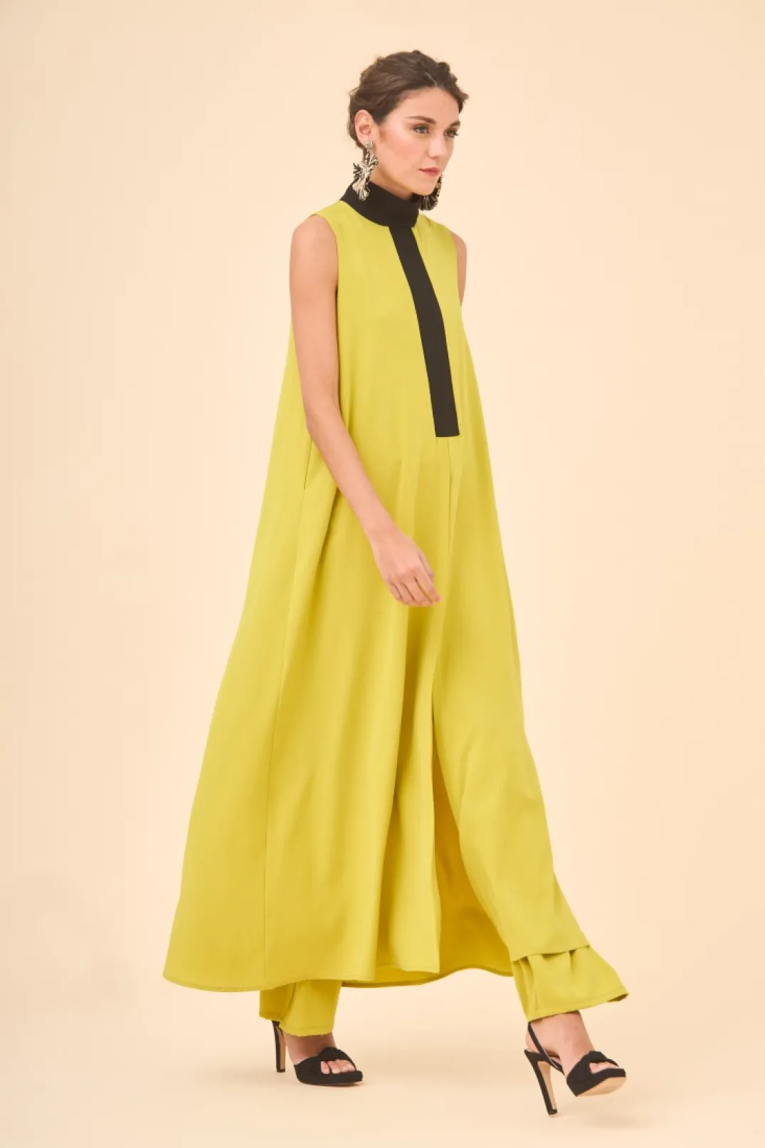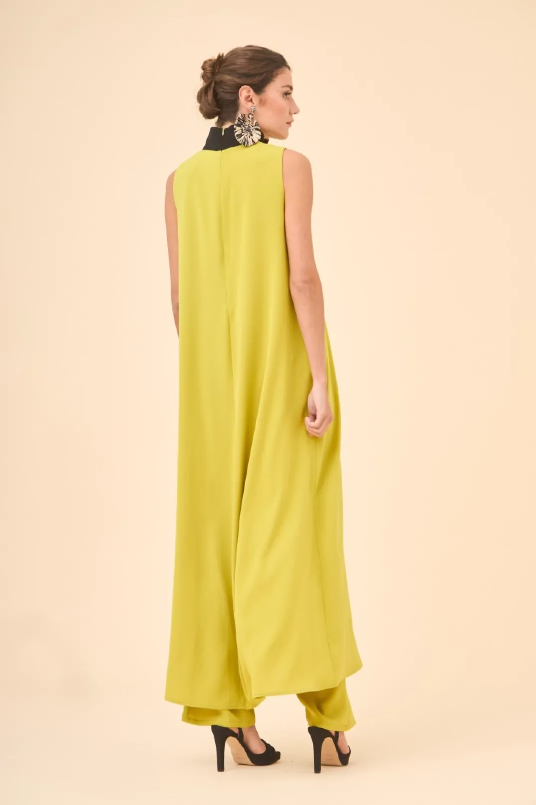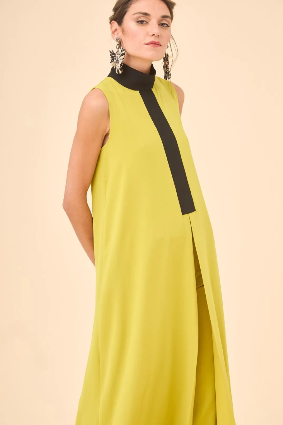 Top largo confeccionado en crepe oliva. Cuello alto y detalle en el pecho a contraste confeccionado en el mismo tejido en color negro. Sin mangas, largo asimétrico y abertura delantera. Cierre con cremallera invisible trasera.