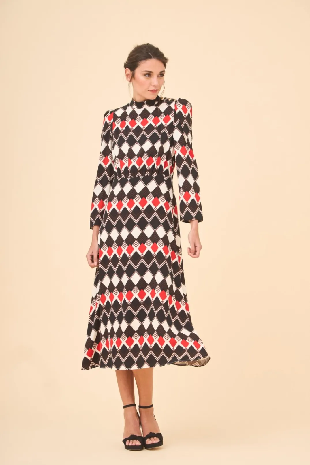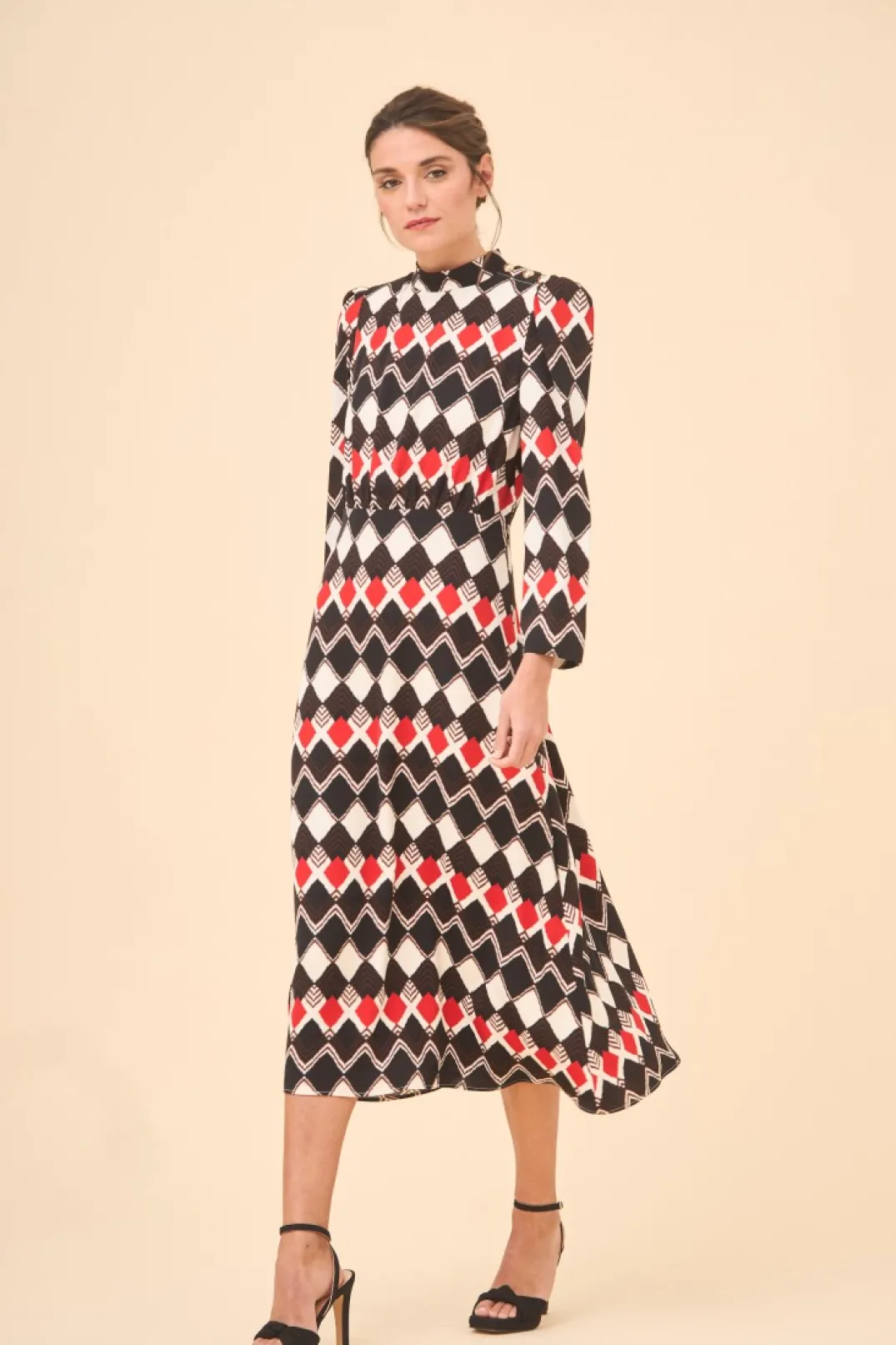 Vestido midi confeccionado en tejido estampado de rombos. Cuello subido y manga larga. Detalle de botones dorados en el hombro. Cuerpo fruncido y falda midi con vuelo.