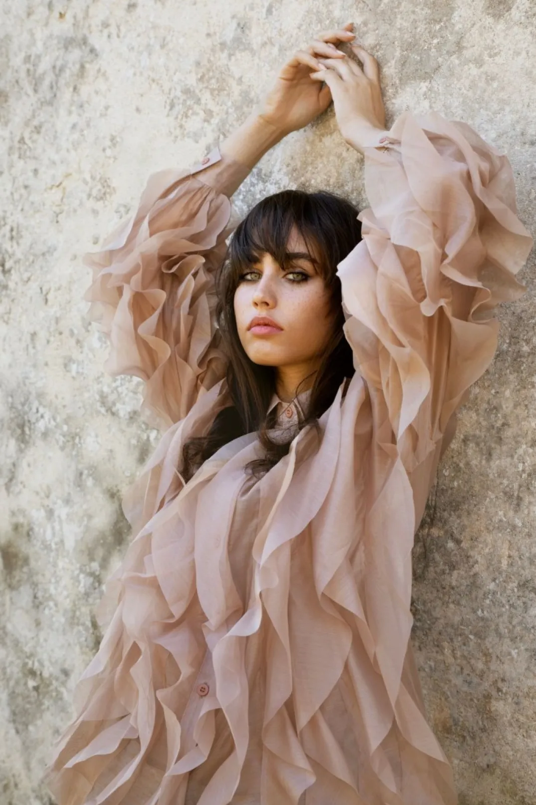 Camisa confeccionada en tejido de organza color beige. Mangas abullonadas y detalle de volantes. Cuello con solapas. Cierre con botones anacarados.