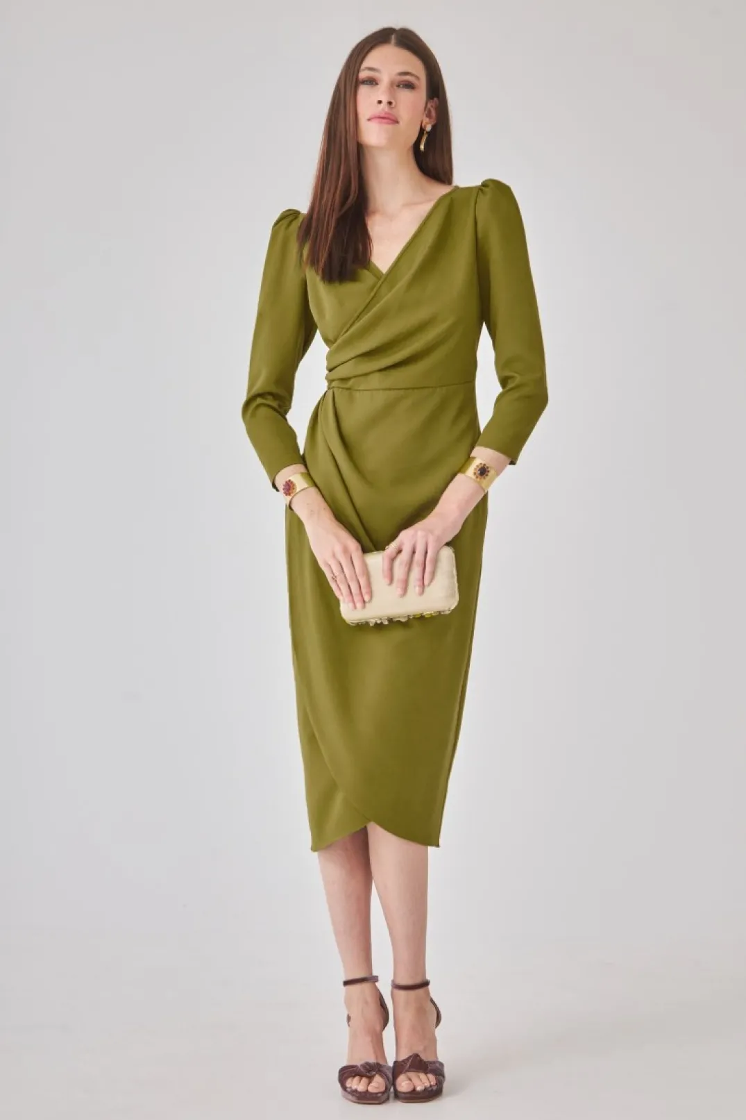 Vestido midi de fiesta confeccionado en crepe verde oliva. Escote cruzado terminado en drapeado a la cintura. Manga larga con hombreras.