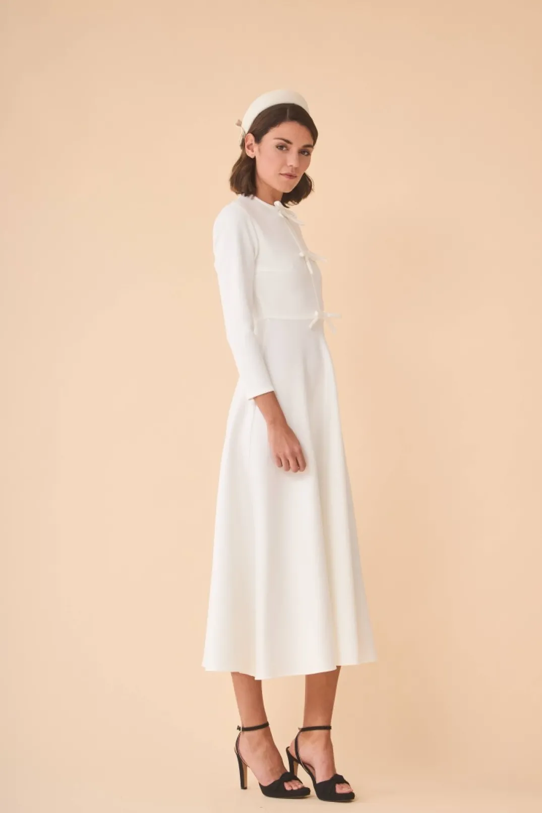 Vestido confeccionado en neopreno color blanco. Cuello redondo y manga larga. Detalles de lazos en el pecho y abertura central. Corte en la cintura y falda evasé. Cierre trasero con cremallera invisible.