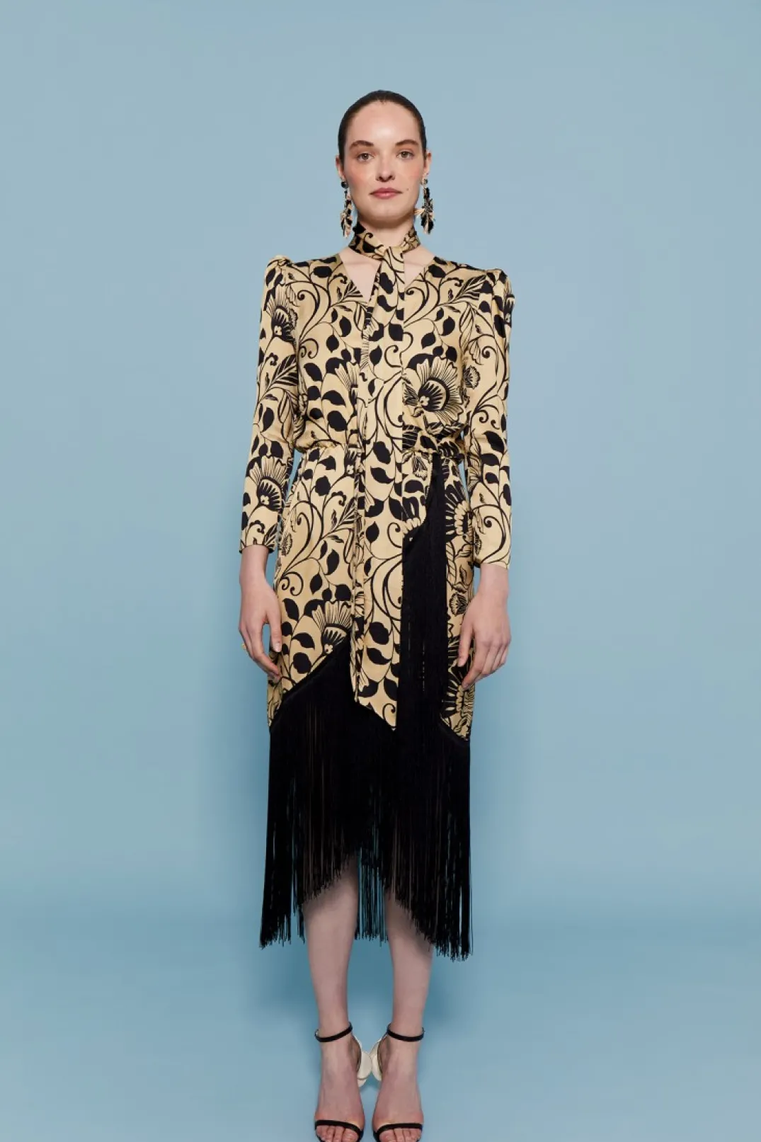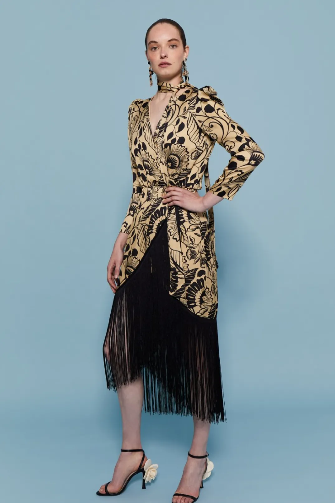 Vestido de fiesta confeccionado en satén estampado. Escote en pico cruzado con forro interior. Manga larga abullonada. Corte en la cintura y falda estilo tulipa con flecos en color negro a contraste.