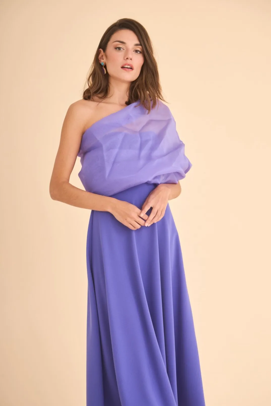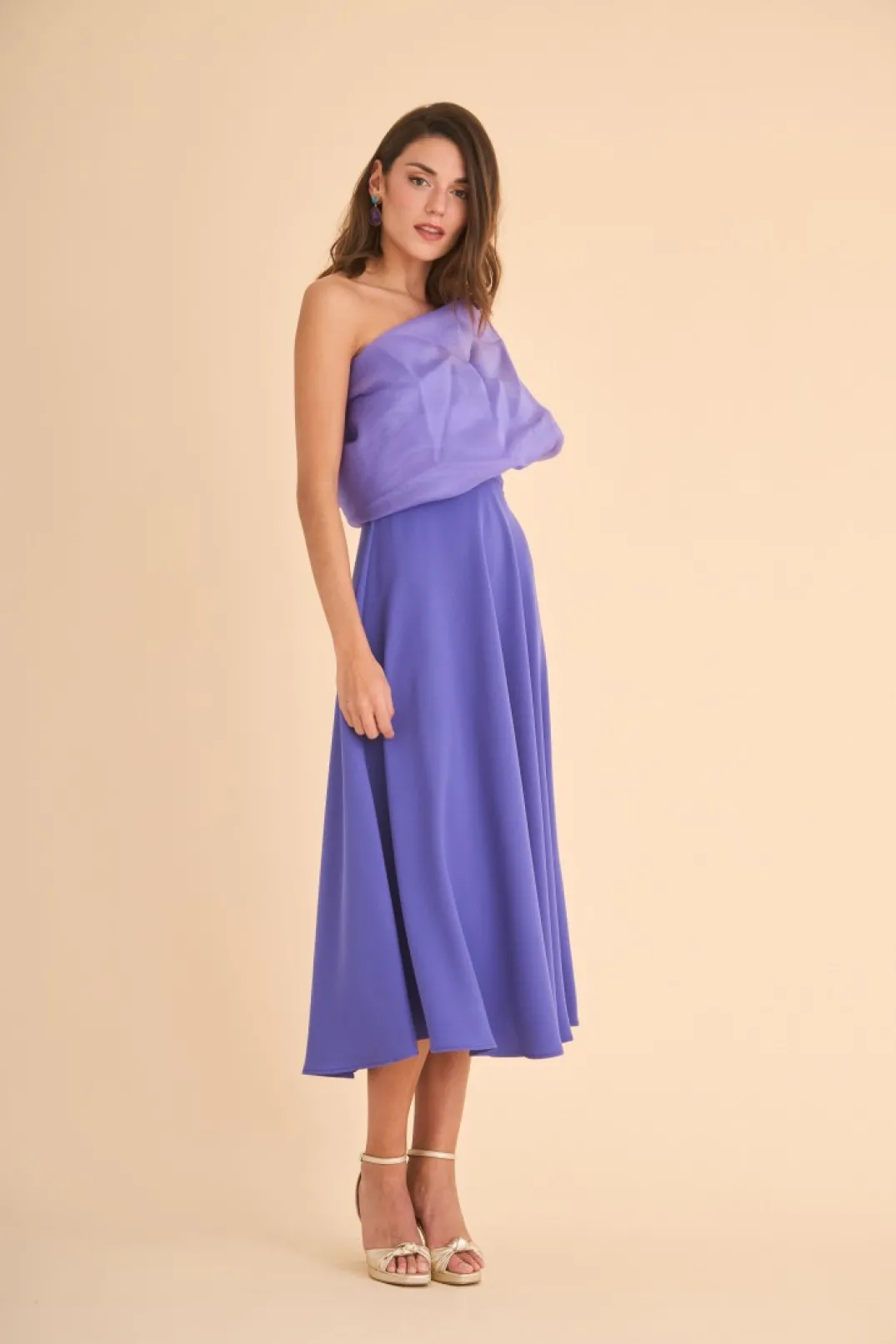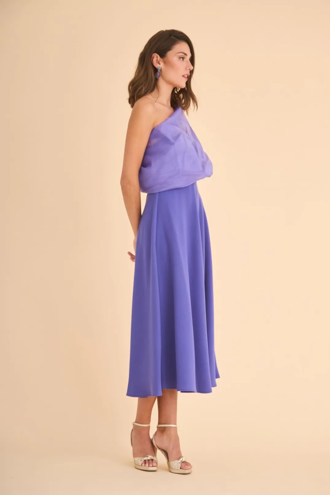 Vestido confeccionado en crepe color morado. Escote palabra de honor. Corte en la cintura y largo midi con falda fluida.