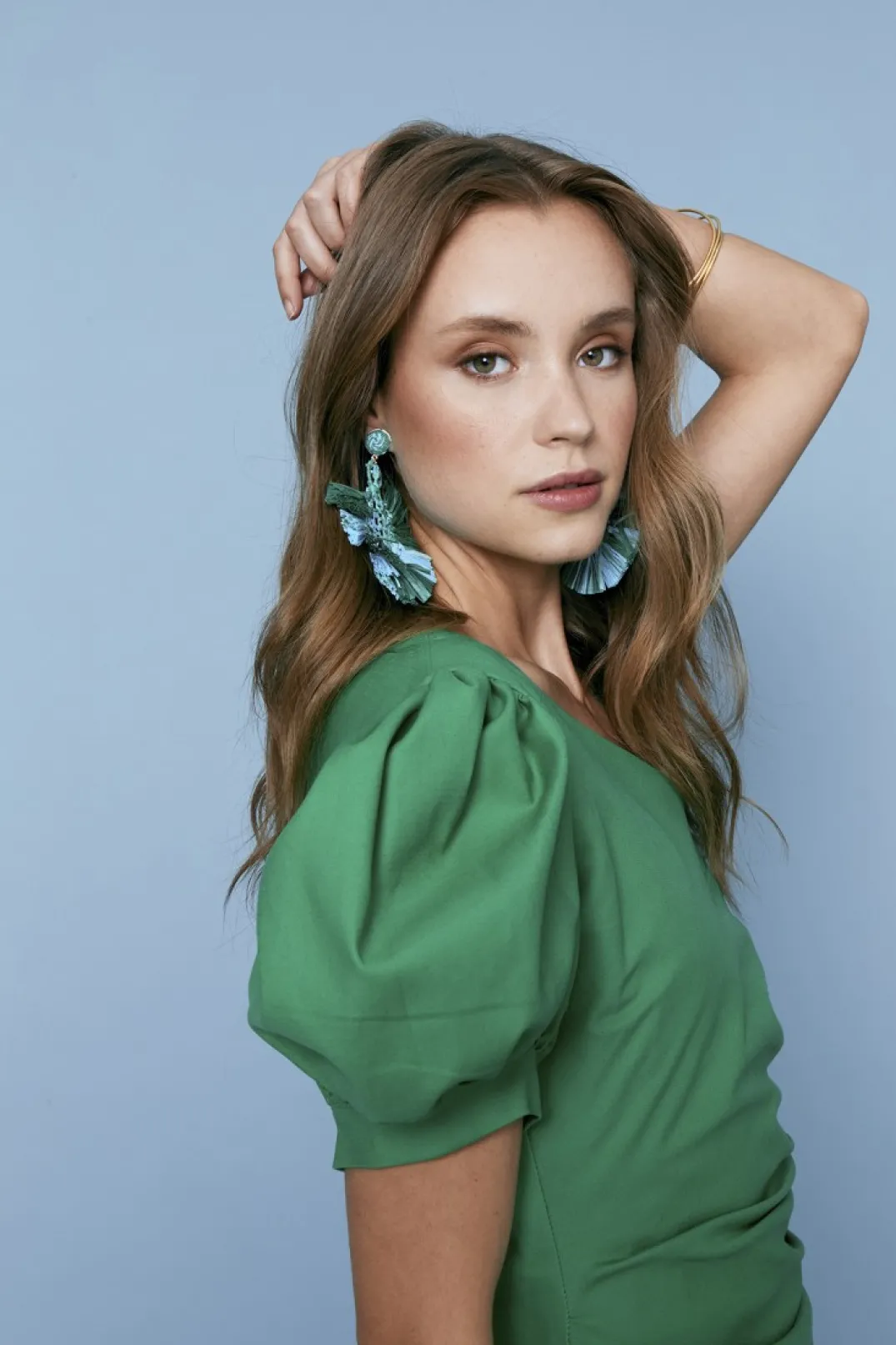 Vestido de fiesta confeccionado en tafeta verde Manga asimétrica abullonada. Frunce en la cintura y largo midi con maxi volante con volumen en el bajo. Cierre con cremallera invisible lateral.