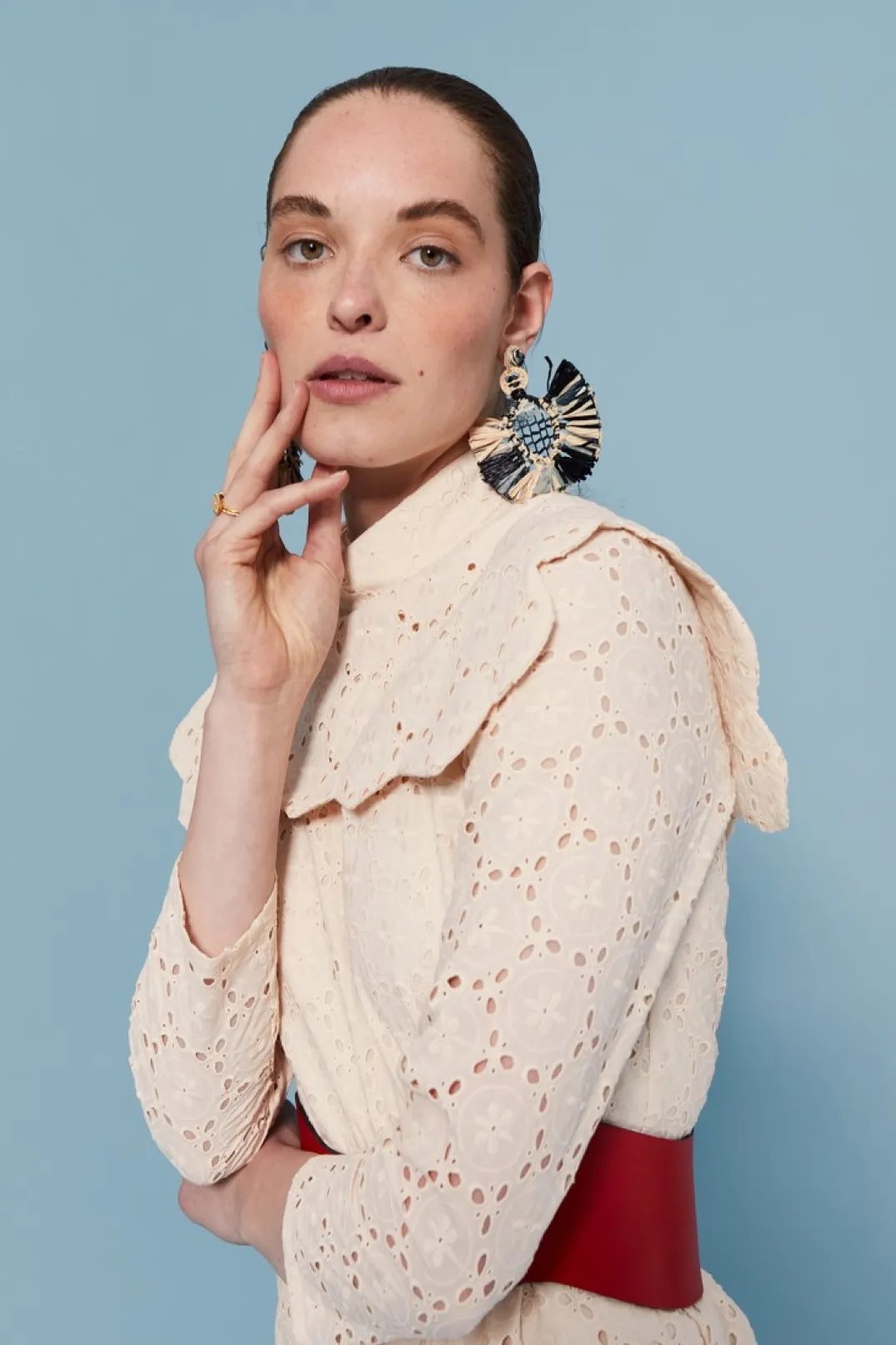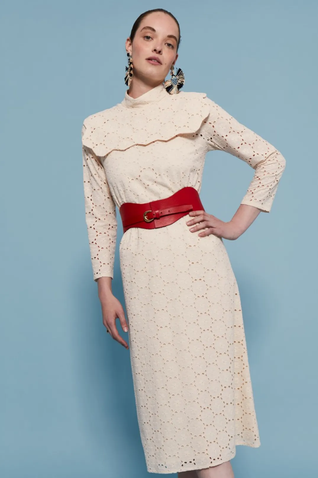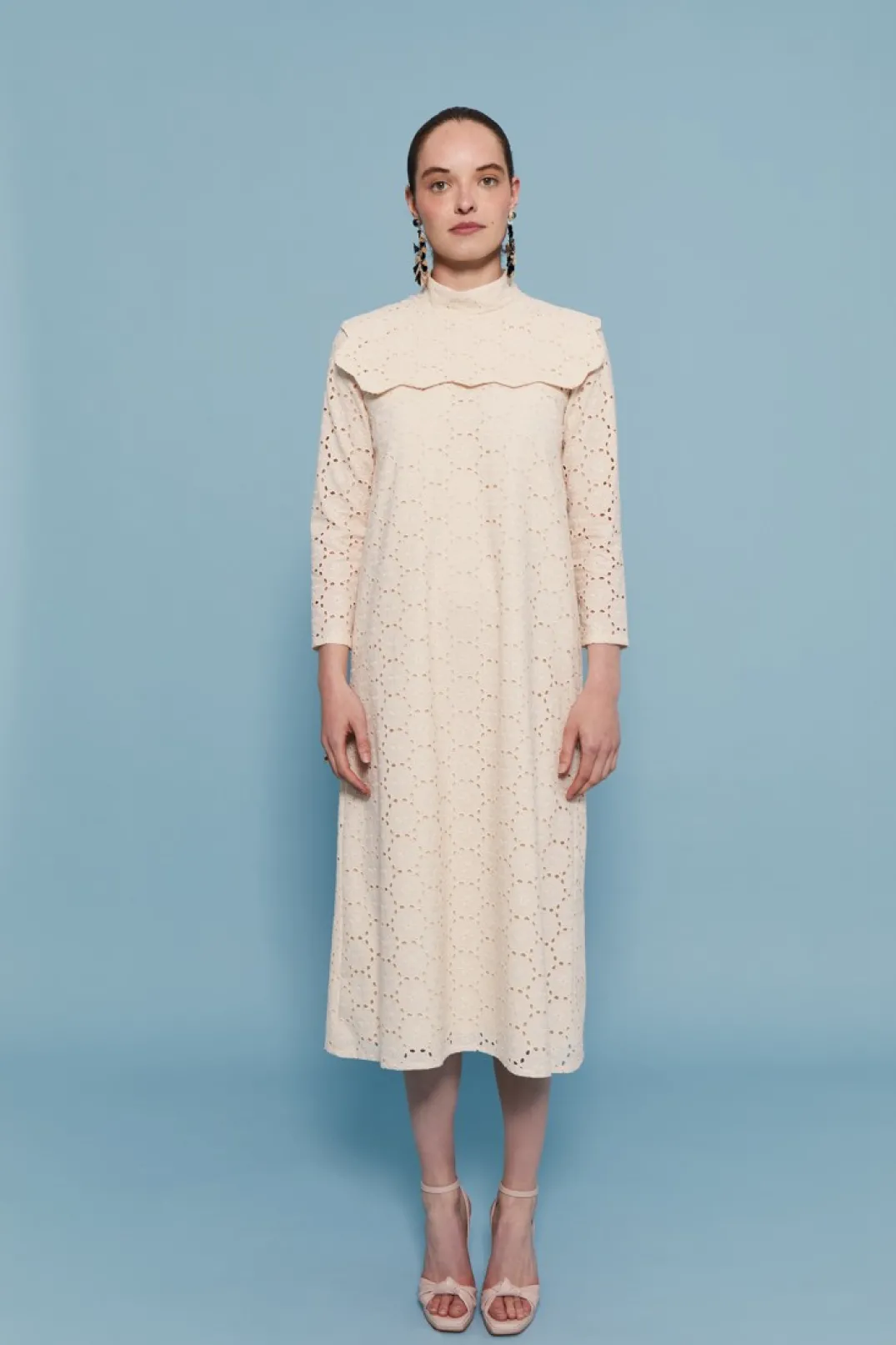 Vestido confeccionado en tejido troquelado en color beige. Cuello perkins con maxi solapa. Manga larga sin forro interior. El vestido es de corte recto y lleva forro en el mismo tono.